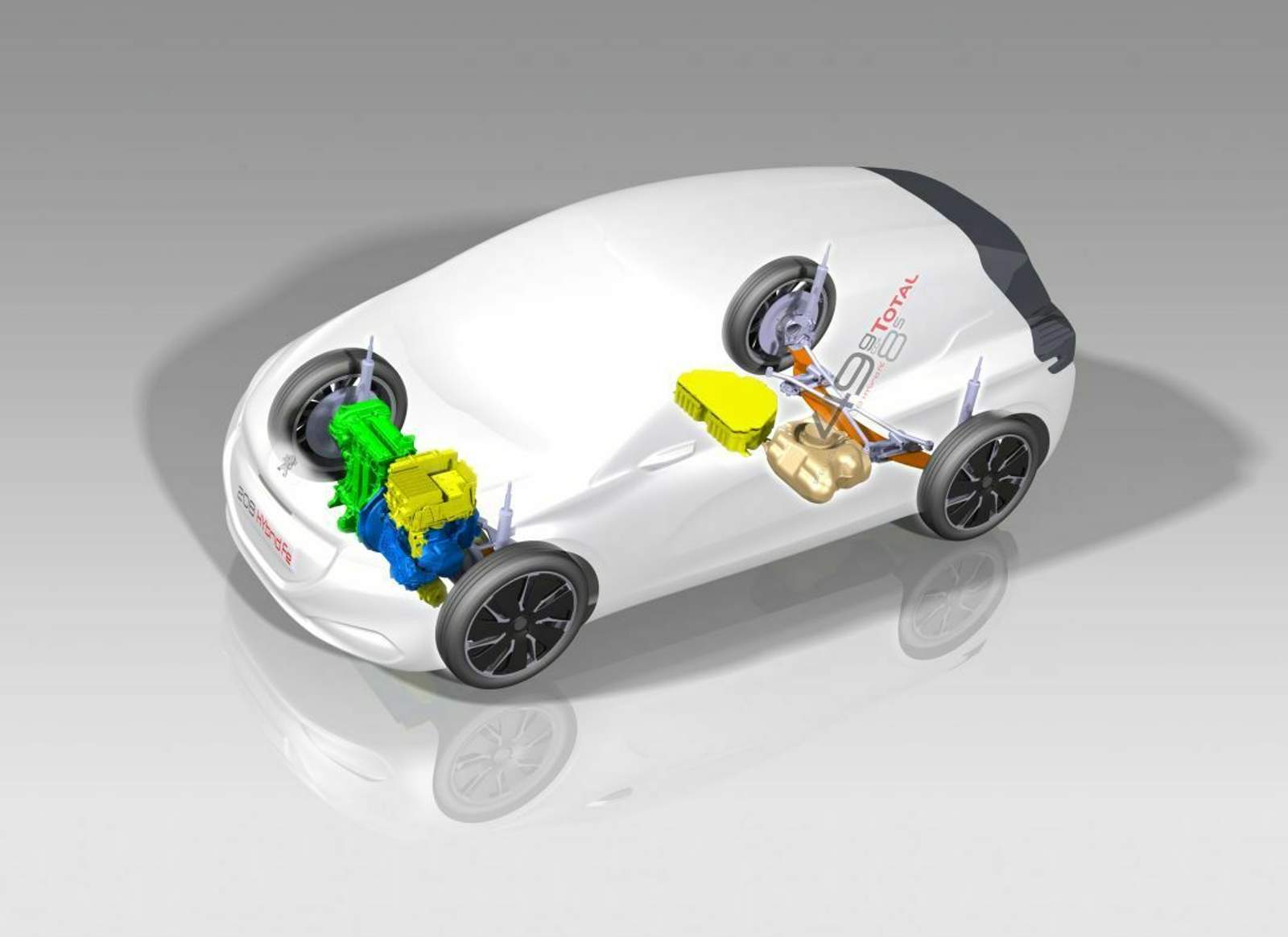 Hier zu erkennen: Beide Motoren treiben die Vorderachse an, Tank und Lithium-Ionen-Akku befinden sich im Heck