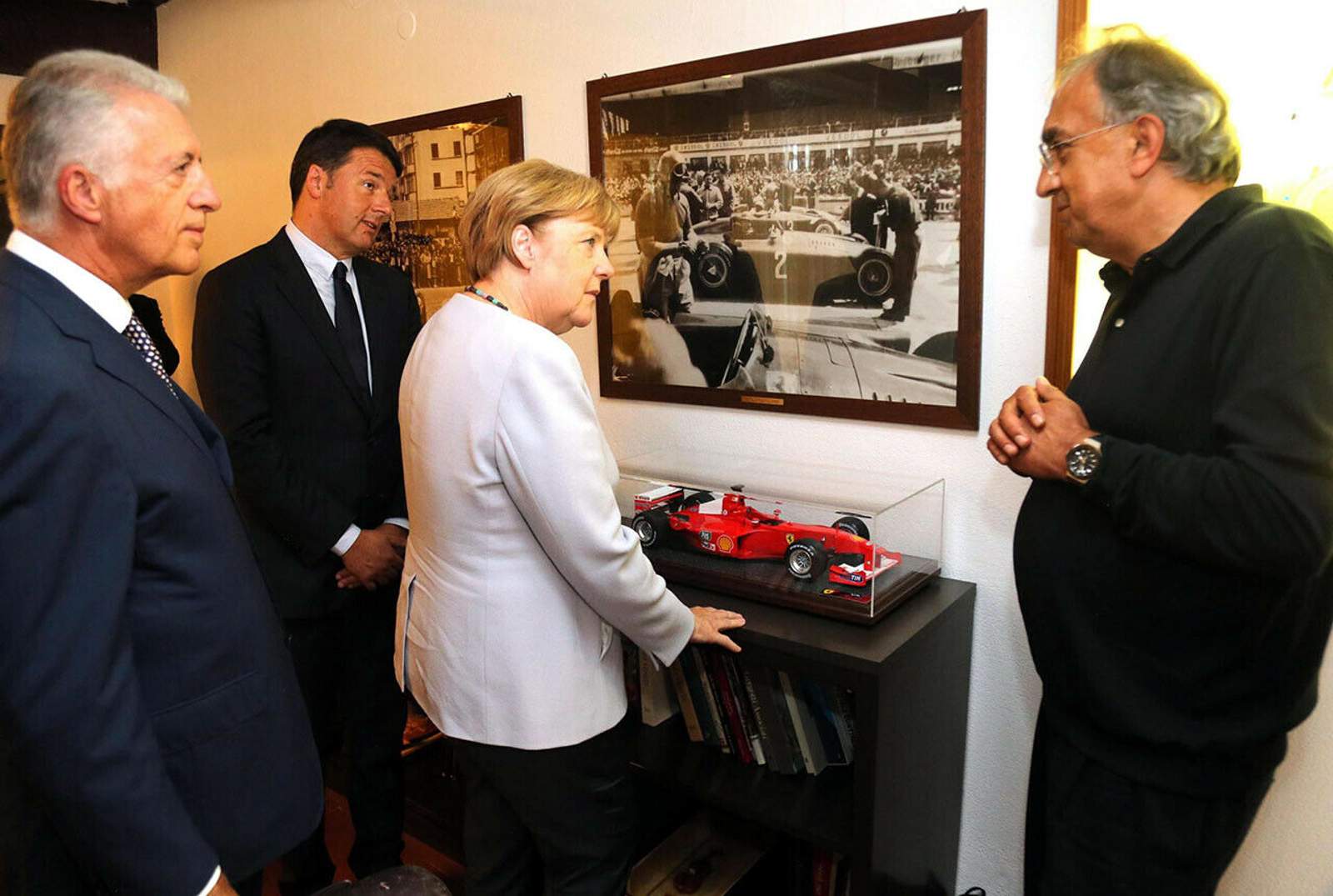Renzi, Merkel, Marchionne: Der Fiat-Chef führte die Kanzlerin und ihren italienischen Kollegen (hinten links) durch die Ferrari-Zentrale