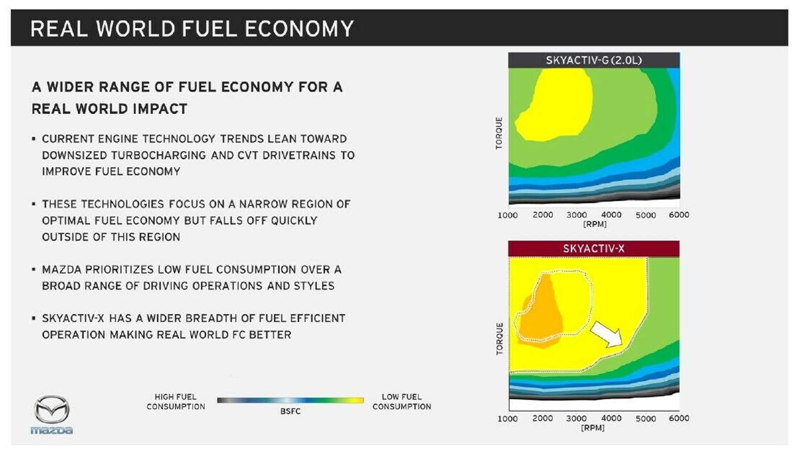 Der effiziente Betriebsbereich des neuen Motors im Vergleich zum aktuellen Mazda-Benziner