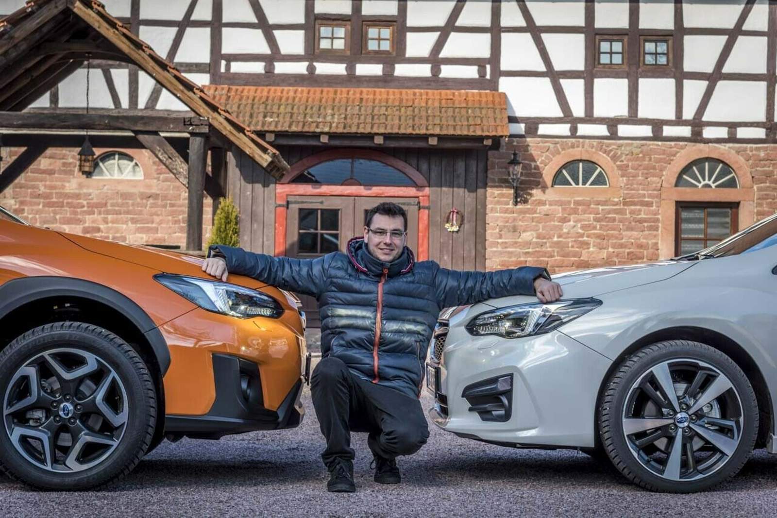 MOTOR-TALK-Redakteur Sven Förster mit Subarus Kompakt-SUV XV (li.) und Subarus Kompaktmodell Impreza (re.)