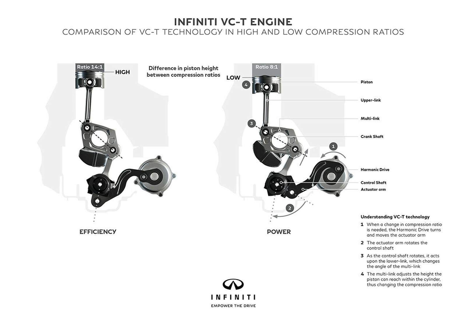 Bei Infinitis VC-T-Motor ändert sich mit der Position des oberen Totpunktes das Verdichtungsverhältnis. Unter Last (re.) beträgt es 8:1, unter Teillast 14:1 (li.)