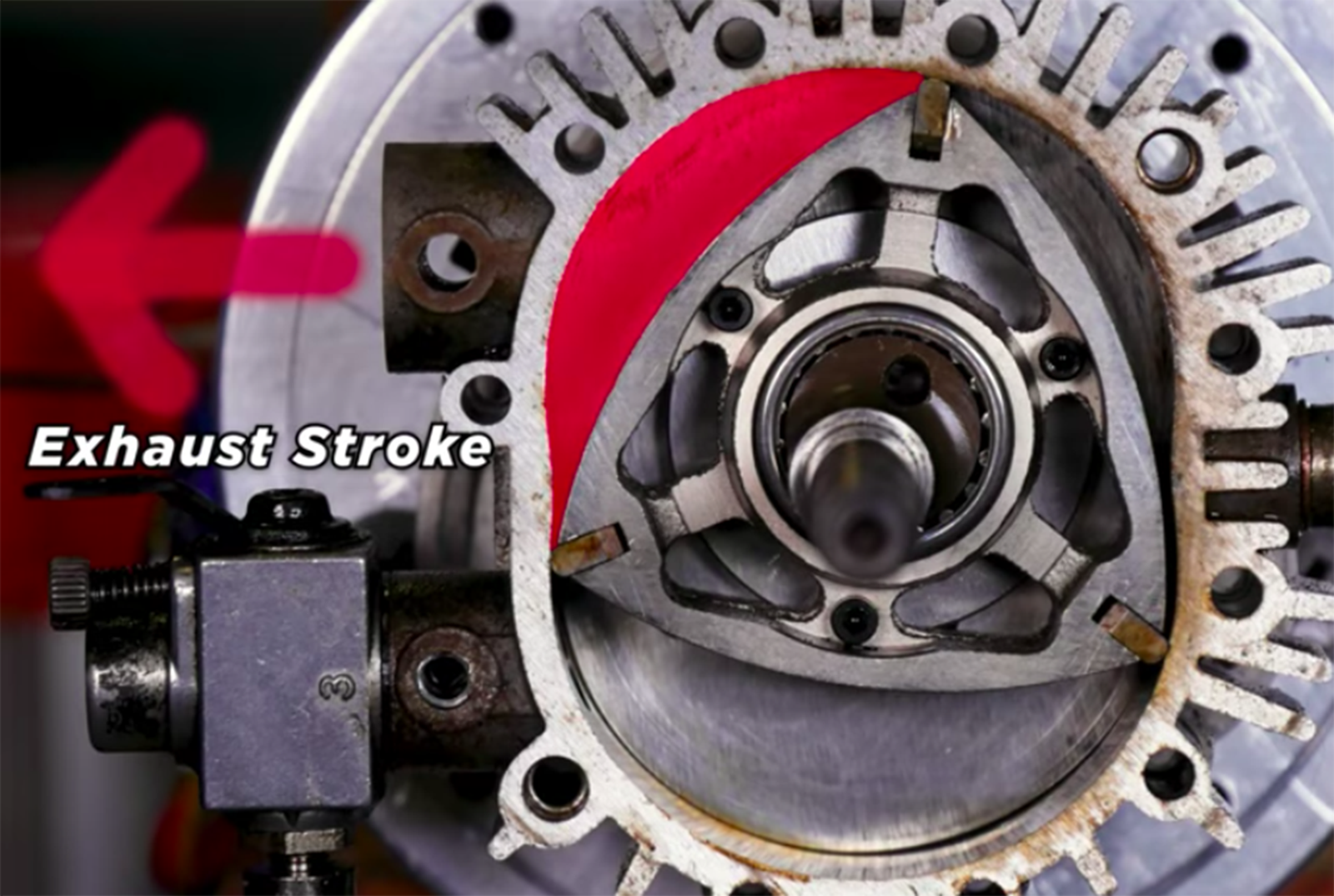 Die Arbeitsweise eines Wankelmotors (4 von 5): Über die Auslassöffnung entweichen die Abgase