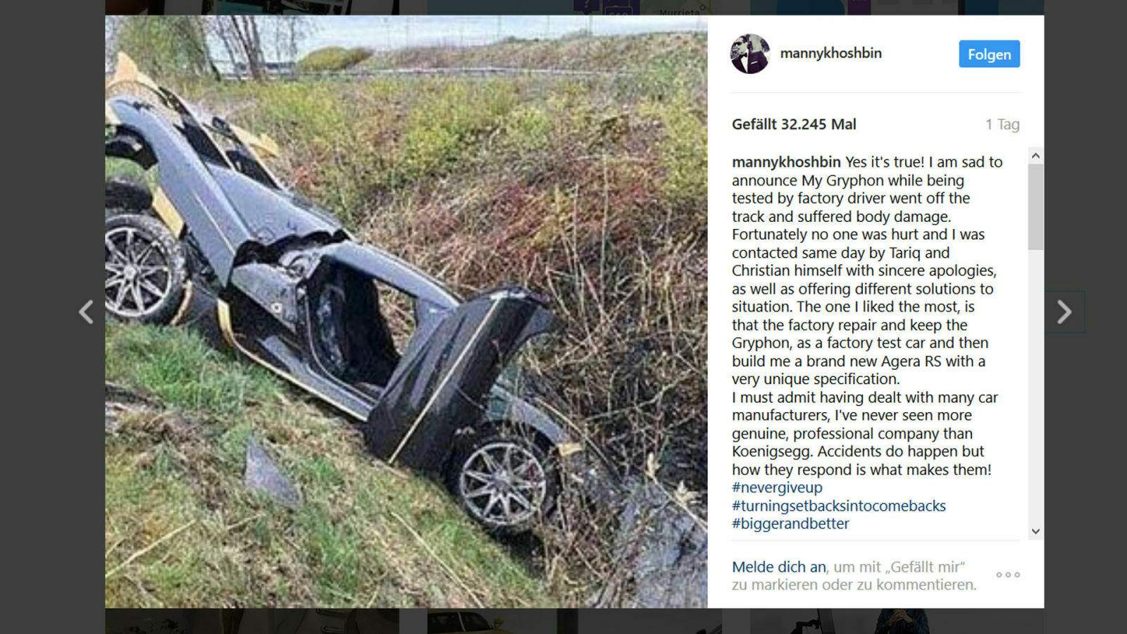 Der Koenigsegg flog auf der ehemaligen Saab-Teststrecke ab. Besitzer Manny Khoshbin nahm es auf Instagram locker