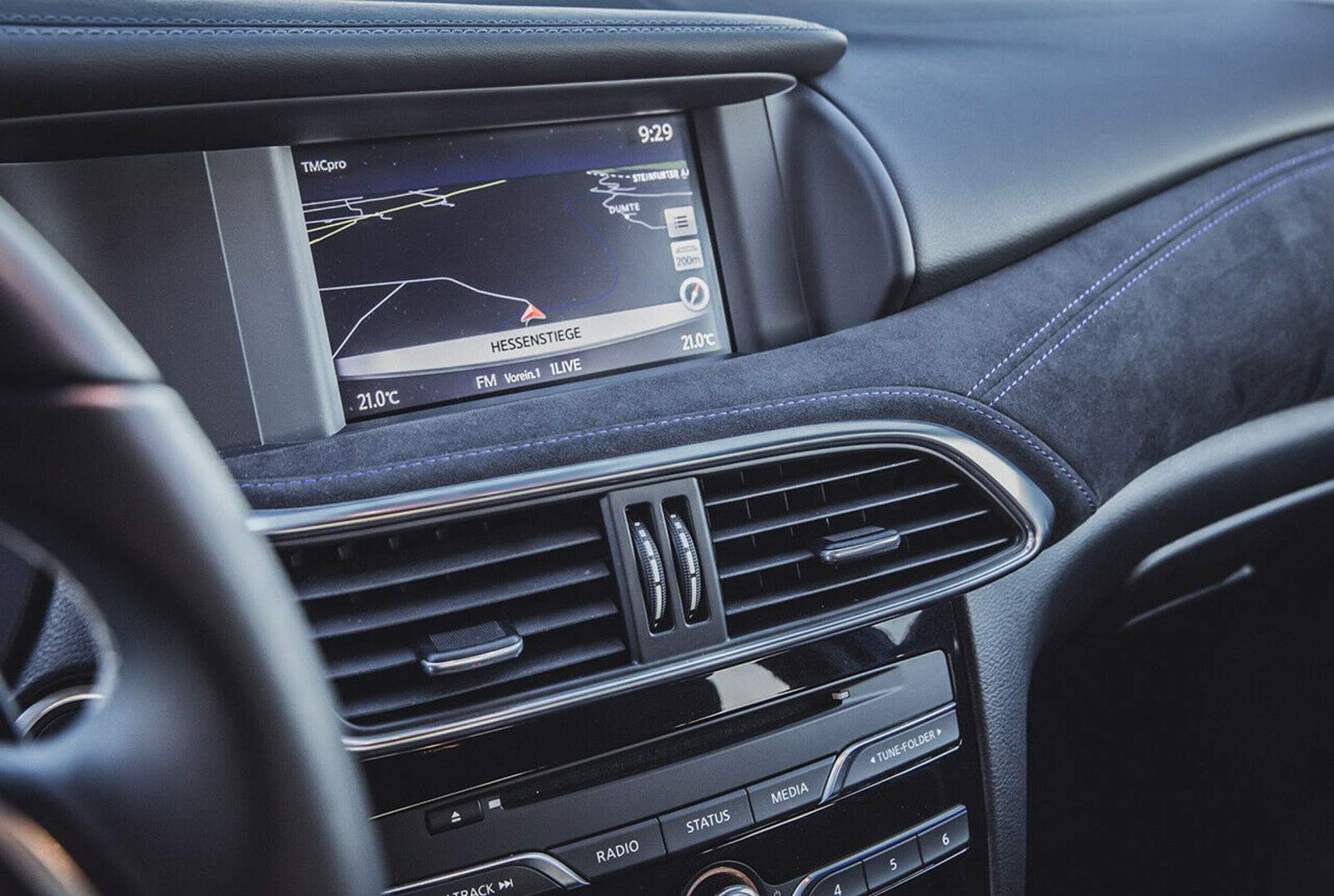 Schön: Alcantara-Zierleisten mit Kontrastnaht. Auch beim Infotainment hätte Infiniti besser "beim Daimler" einkaufen sollen. Die Position und Größe des Displays passt aber