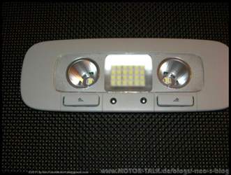 Im ersten Schritt hatte ich in der vorderen Innenleuchte 2x 5 LED Leuchtmittel für den Austausch der W5W-Lampen in den Lesespots und eine 9 LED Soffitte für die mittlere Leuchte vorgesehen. Die Lichtausbeute ist etwas besser als mit den Glühlampen. Zwischenzeitlich ist mein 32 LED-Panel gekommen, das ich nun an Stelle der mittleren Leuchte eingesetzt habe. Und jetzt ist es wirklich HELL!