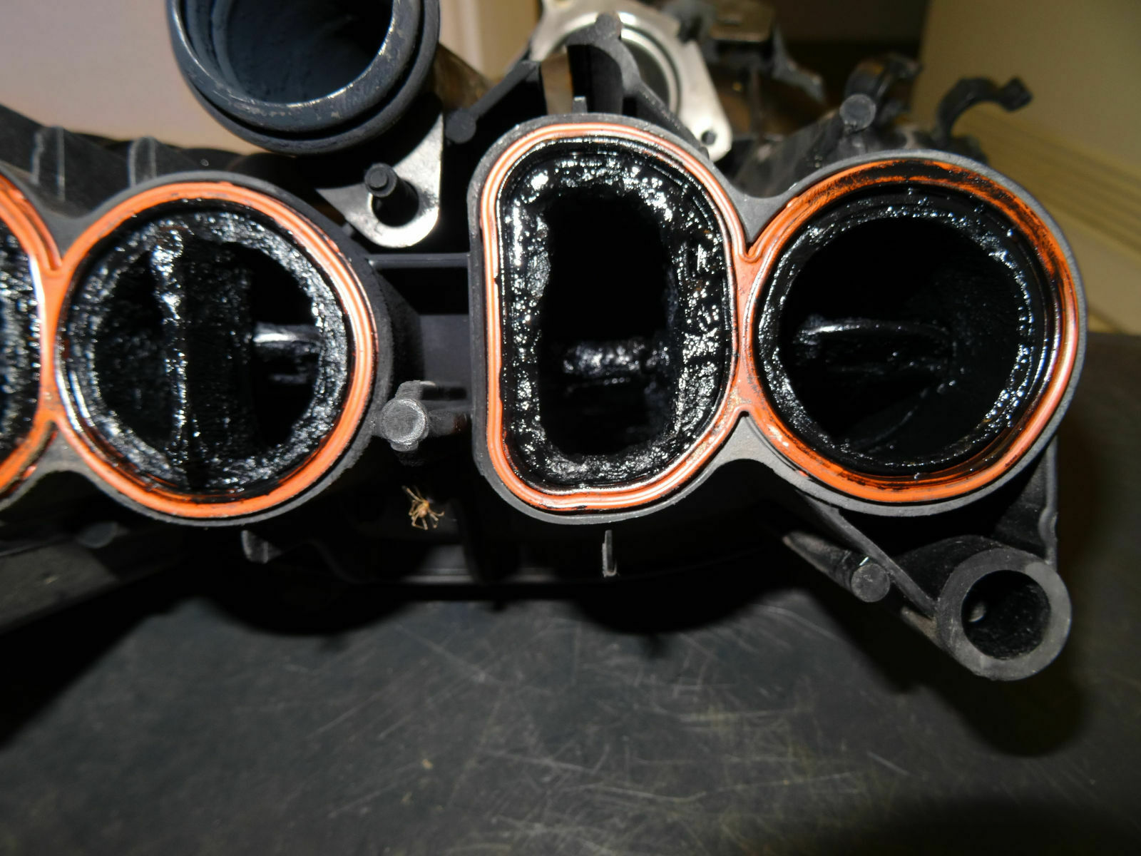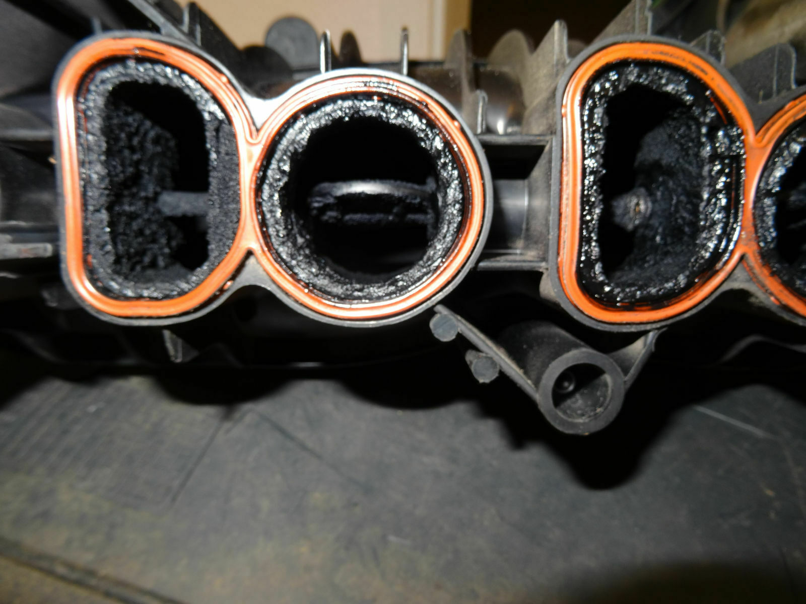 Auch meine ASB war schon ordentlich verkokt (siehe Bilder) und eine ca. 2 – 3 mm starke Ruß/Schlammschicht war im Inneren verteilt, aber ich habe auf Bildern und live auch schon weit schlimmeres gesehen. Besonders dick war die Kruste an der Stelle, wo die Abgase in die ASB geleitet werden. Auch das Einleitungsrohr aus Edelstahl saß fest, ich bekam es erst nach dem 2. von 4 Spüldurchgängen heraus. Den Ladedrucksensor und den Stellmotor für die Drallklappen hatten wir selbstverständlich vorher entfernt. Für die Spülprozedur hatte ich mir natürlich spezielle Schutzhandschuhe und eine Schutzbrille besorgt, allerdings wäre auch eine Gasmaske gut gewesen, denn in den ersten 10 Minuten gaste das Gemisch sehr stark.
