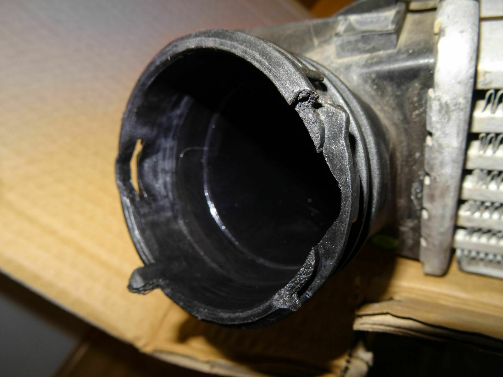 Die Federklammer welche das Ladeluftrohr im Anschlussflansch des LLK fixiert, hing etwas weiter oben am Ladeluftrohr. Zunächst versuchte ich die Federklammer wieder am richtigen Platz einzubauen, bis ich fühlen konnte, das am Rand wo die Federklammer im LLK gehalten wird ein ganzes Stück fehlt. Somit ließ sich das Ladeluftrohr nicht mehr im LLK einrasten.