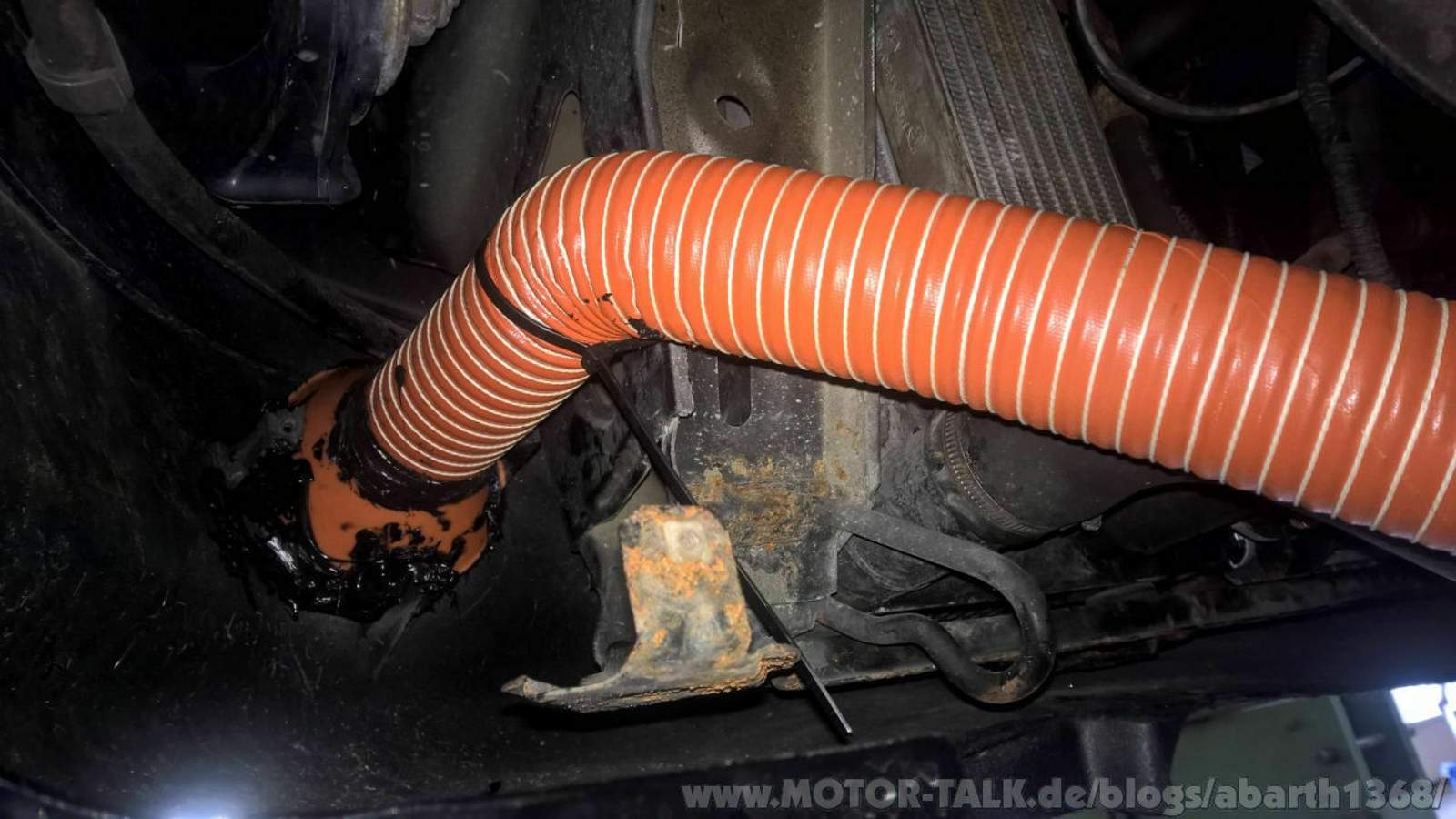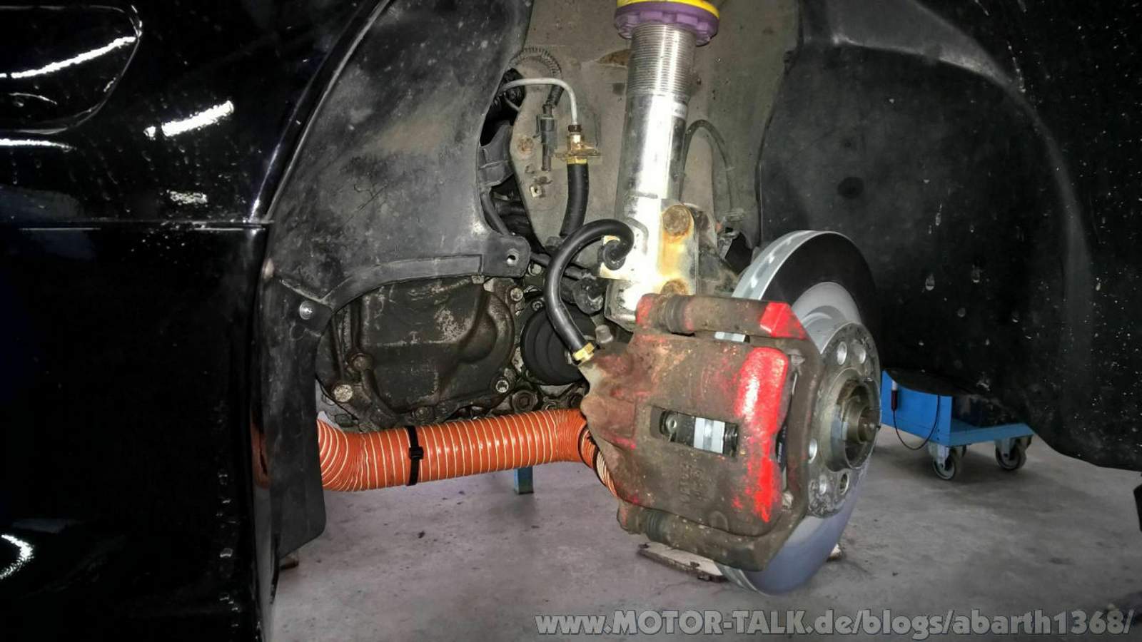 Bei der nächsten Fiat-Garage angerufen, nicht mehr lieferbar... Bei meinem Cousin angerufen, nicht mehr Lieferbar, aber er habe zwei an Lager. Durch das "knappe" Angebot konnte ich keinen wahnsinnig guten Preis aushandeln, hab dann nur das eine Lager ersetzt, denn nur das war richtig "Matsch". Die Stahlflexleitungen konnten wir eins zu eins ersetzen, die passten zu 100%, das hat mich schon recht überrascht, vor für den Preis. Für die Bremsbelüftung konnte ich die Löcher für die Nebelscheinwerfer nutzen, denn die brauche ich sowieso nicht - hab zwei ganz normale Trichter gekauft, die Enden abgeschnitten, schwarz gespritzt und dann anschliessend mit der Leitung verklebt und diese wiederum mit der Aussparung der Nebelscheinwerfer. Die Leitung habe ich mit Kabelbinder an mehreren punkten befestigt, das hält bombenfest und ich habe das so eingestellt, dass bei Volleinschlag nichts streift. Das Einkleben sieht Qualitativ nicht super aus, aber es hält und von aussen erkennt man nichts.