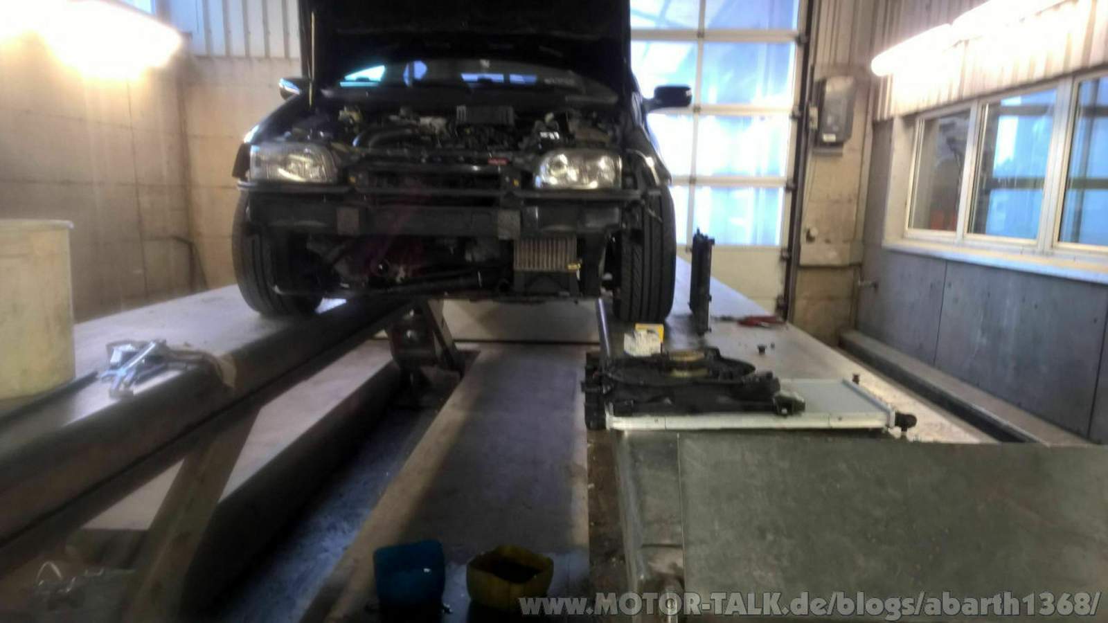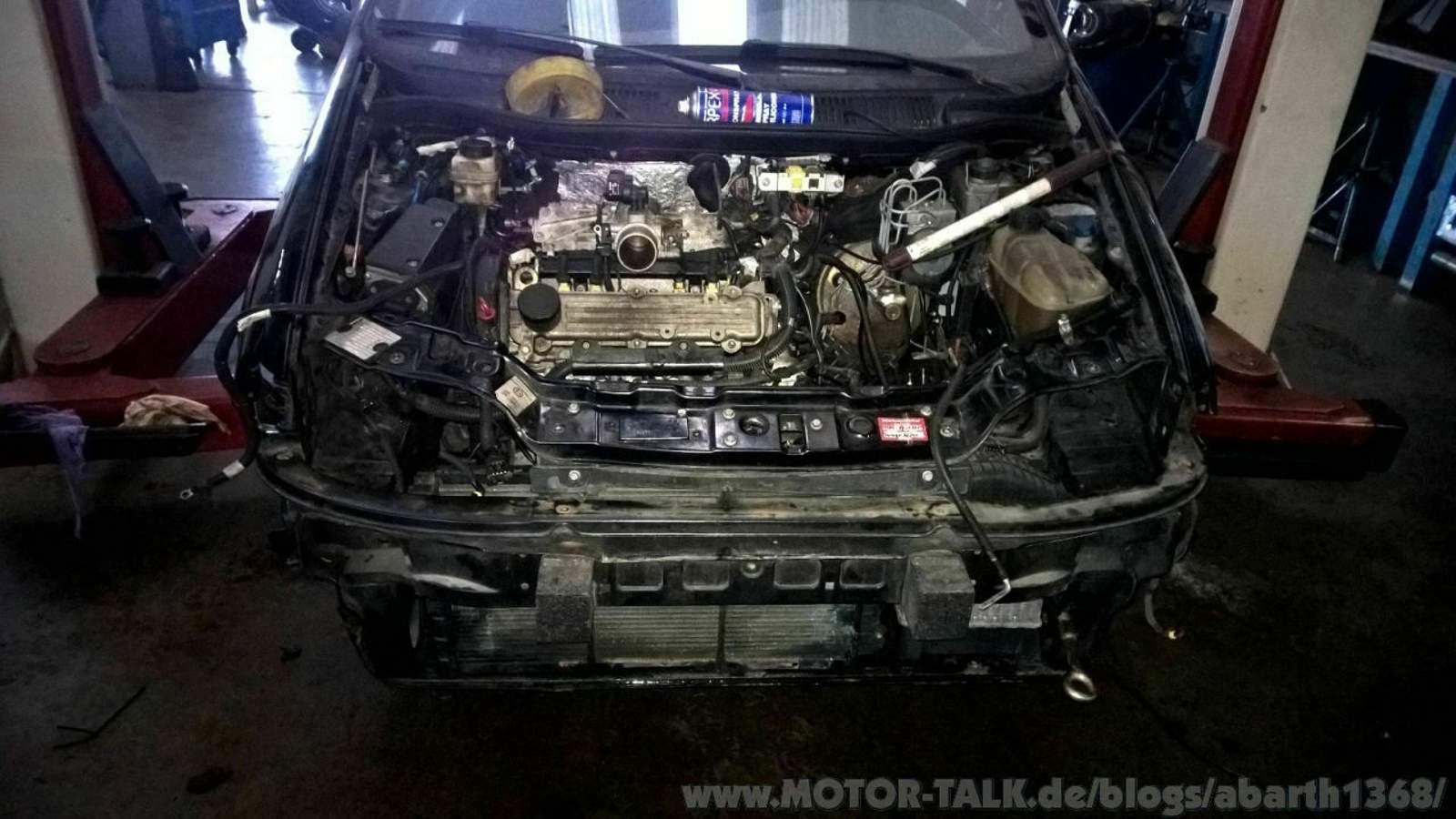 An einem anderen Samstagnachmittag fingen wir mit dem Motorausbau von meinem Punto an. So als kleine Randbemerkung, unglaublich wie tief mein Punto ist, das verfolgte mich durch das ganze Projekt - ich musste ihn zuerst immer mit dem originalen Wagenheber auf Holzblöcke stellen, damit wir überhaupt mit dem Lift darunter gekommen sind