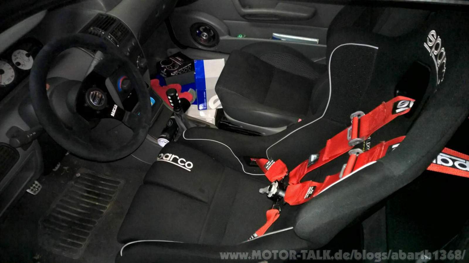 Wie kann man den Innenraum verbessern? Für die Rennstrecke braucht man Seitenhalt, das hatte ich schon früh erkannt, darum hatte ich schon vor 4 Jahren den Sparco Evo verbaut, aber ich wollte noch mehr verbessern. Ich habe immer schwitzige Hände, da rutscht ein glattes Lenkrad gerne einmal, also habe ich mir ein Sparco Lenkrad besorgt (keine Ahnung was für eine Bezeichnung - es ist Rund