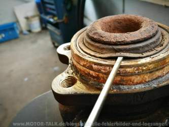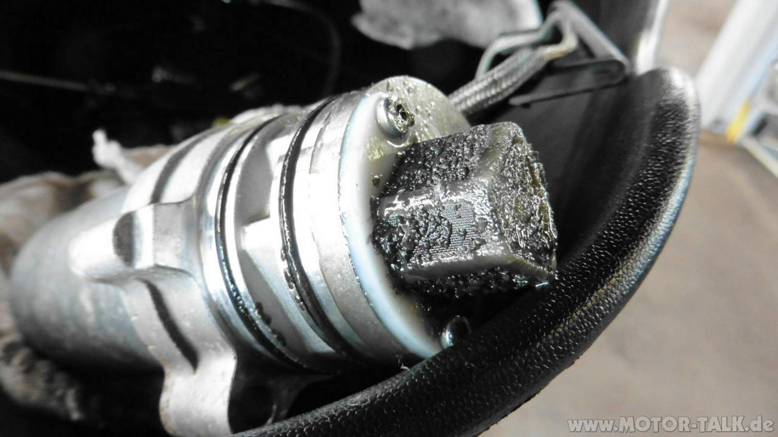 Marke: Audi Modell: A6 Baujahr: 2007 Km-Stand: 277281 MKB: BPP Motor: 2,7 TDI 132 kW Fehlercode: 290 3 Fehlerort: 03 Bremsenelektronik Fehlerbezeichnung: Drehzahlfühler hinten links (mechanischer Fehler - sporadisch) Lösung: - Drehzahlfühler wurde von ATU bereits gewechselt. - Rad hinten links demontiert - Drehzahl über MWB ausgelesen - Raddrehzahl wird erkannt - Drehzahlfühler ausgebaut und Sensorring angeschaut - sieht komisch aus durch das kleine Loch also: - Bremssattel, Bremsscheibe und Radlager ausgebaut - wie vermutet: Sensorring defekt.