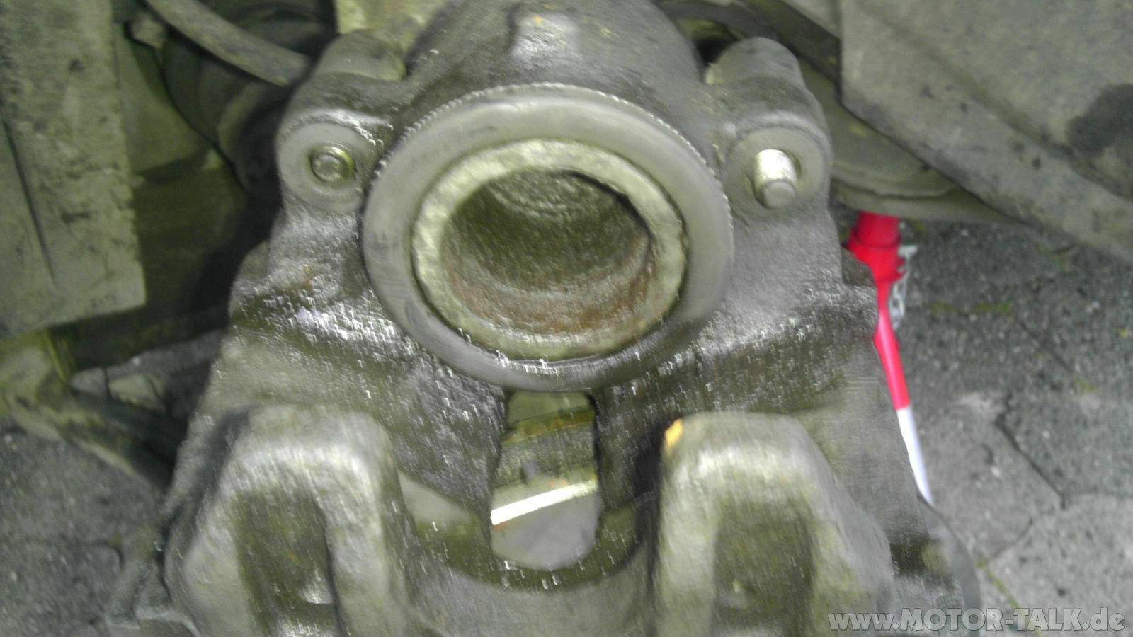 Die Innen- und Außenfläche des Bremssattels mit einer Draht- oder Kupferbürste reinigen. Vorsichtig bei der Gummidichtung des Bremskolben. Grobe Verschmutzungen mit dem Schraubendreher abkratzen.
