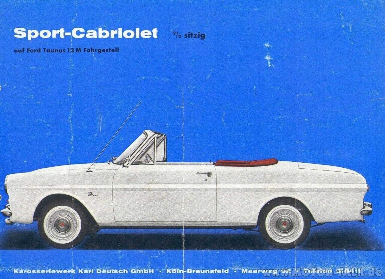 "Für die Freunde sportlichen Fahrens, die Landschaft und Sonne zugleich genießen wollen" So lautete das Verkaufsprospekt für das 12m Cabrio. Der rahmenlose Aufbau von 12m und 15m war für DEUTSCH eine echte Herausforderung – Stichwort Festigkeit. DEUTSCH verbaute zusätzliche Bleche z.B. im Schwellerbereich und einem Stahlrohr, dass mit dem Armaturenbrett und mit dem Kardantunnel zu einer Einheit verschweißt war. Mit dem wunderschönen 17m P2 präsentierten sich alle Ford-Cabrios von DEUTSCH nicht mehr als Viersitzer, sondern als 2+2-Sitzer. Der Grund war einfach, es sah nicht nur schicker aus und war kostengünstiger, sondern die Karosserie war dadurch auch stabiler.