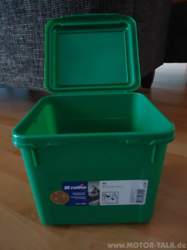 Bisher hatte ich meine Warnwesten lose dort reingepackt, was mir aber nicht wirklich gefiel. Bei meinem letzten Baumarktbesuch fand ich eher zufällig eine Biomülltonne für den wohl eher kleinen Haushalt und mit einem kleinen Klemmholz auf der Rückseite hab ich nun einen verschliessbaren Behälter hinter der Verkleidung.