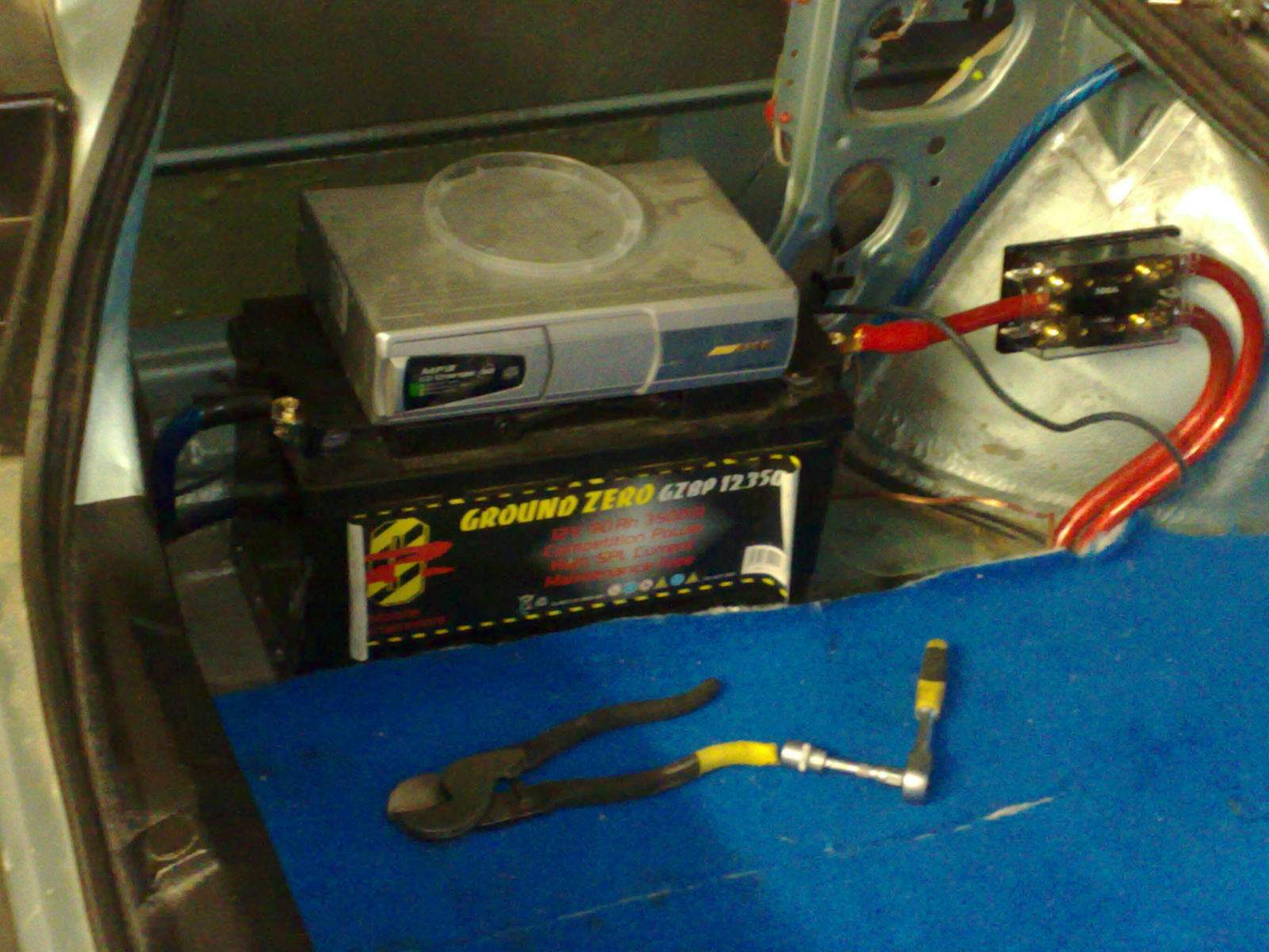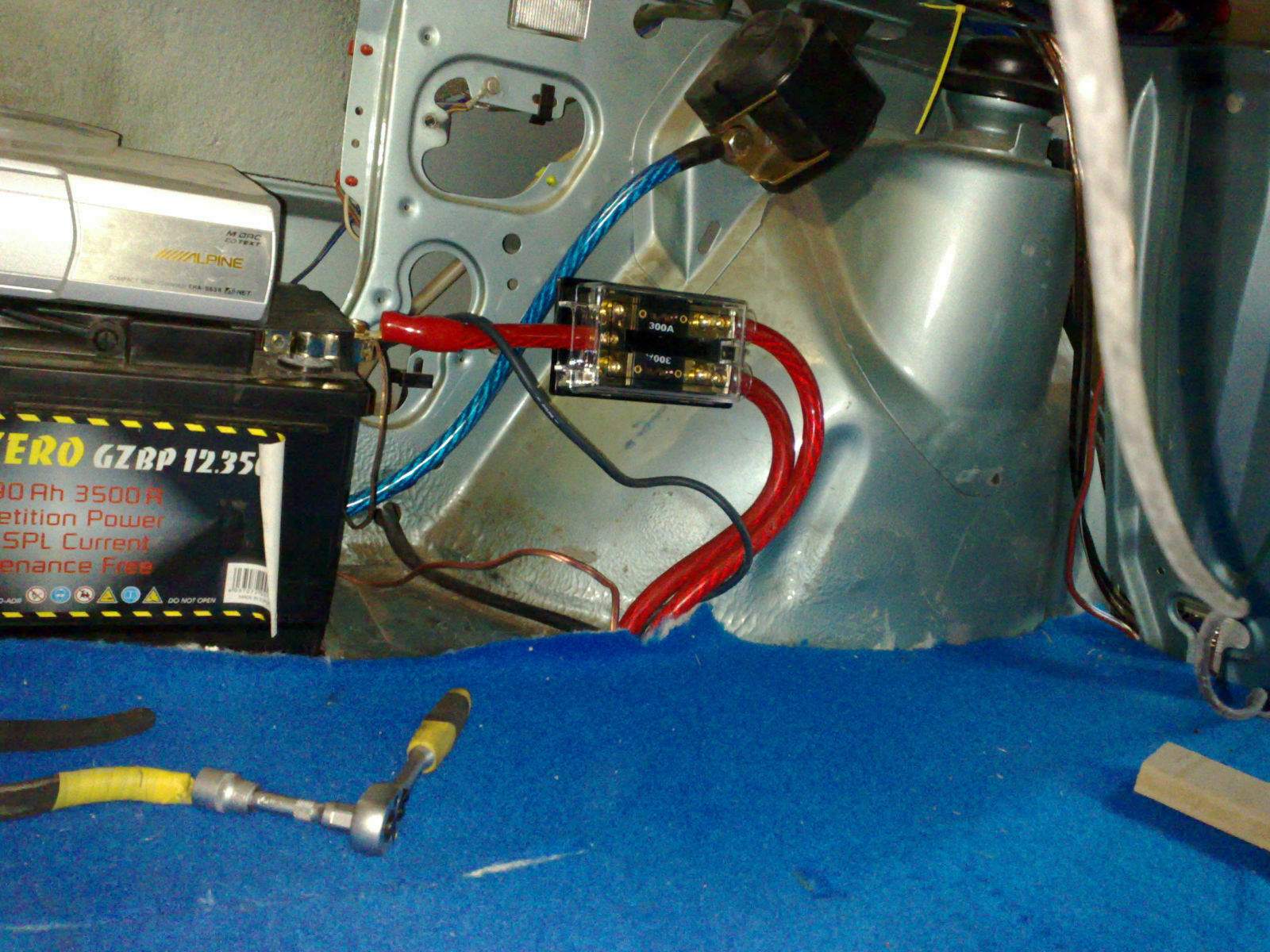 Dann habe ich das Stromkabel gezogen 50mm² von der Batterie zur 2. Batterie. unter der Rücksitzbank habe ich dann noch das Kabel gesplittet mit einem Audison Verteiler. Von dem Verteiler sollen zwei Endstufen gespeißt werden, die drüber vebaut werden.