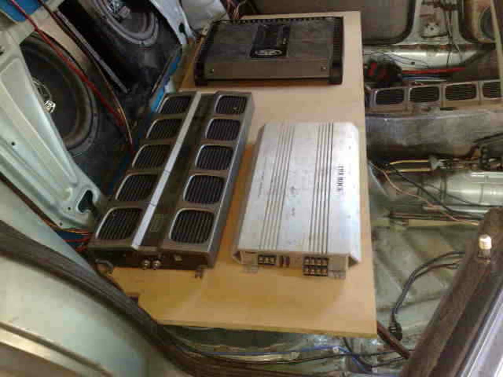 auf die Platte geschraubt. Dann habe ich die Endstufen verkabelt, dann habe ich erstmal mein Teppich im Auto verlegt (dunkelblau).