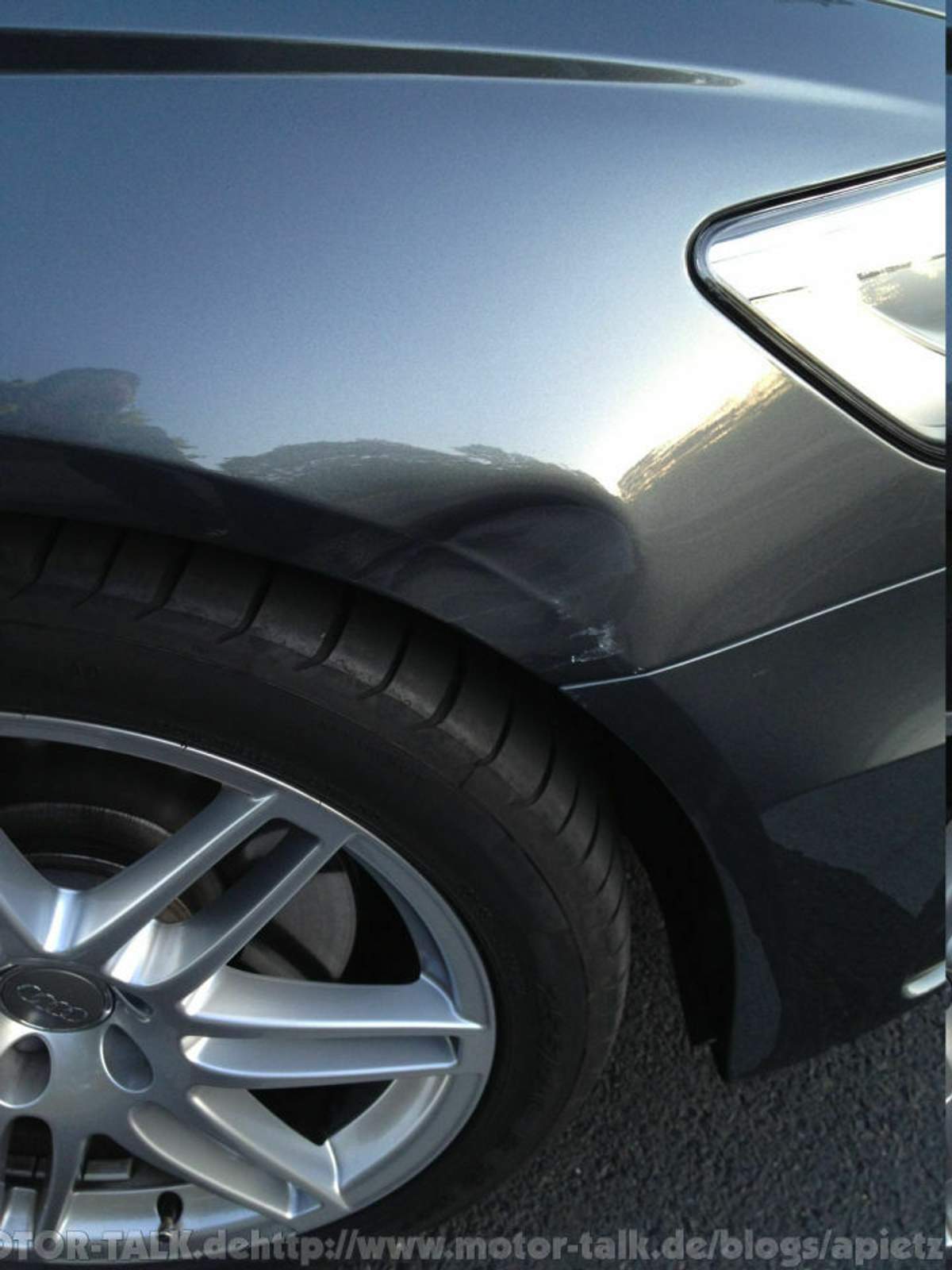 ... der rechte Kotflügel war eingedrückt und auf dem Lack war Abrieb von ihrem Reifen und wohl auch etwas von Ihrer Felge.