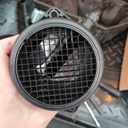 Also, altes Ausbauen (Schlauchschelle lösen, Stecker für Luftmassenmesser abziehen, Deckel abschrauben, innen die kleine Klemme lösen und nach oben abziehen) und den Luftmassenmesser abschrauben (2 x Torx). Jetzt können wir den neuen Luftfilterkasten "umrüsten". Eigentlich müsste ich die Kosten oben etwas reduzieren, da im Kasten ein neuer Luftfilter drin ist. Nach ein paar Wochen mit dem neuen Luftfilter, den ich einst beim Tausch der Riemen mitmachte, ist der schon dreckig... Naja, komm, wenn man den schon tauschen kann