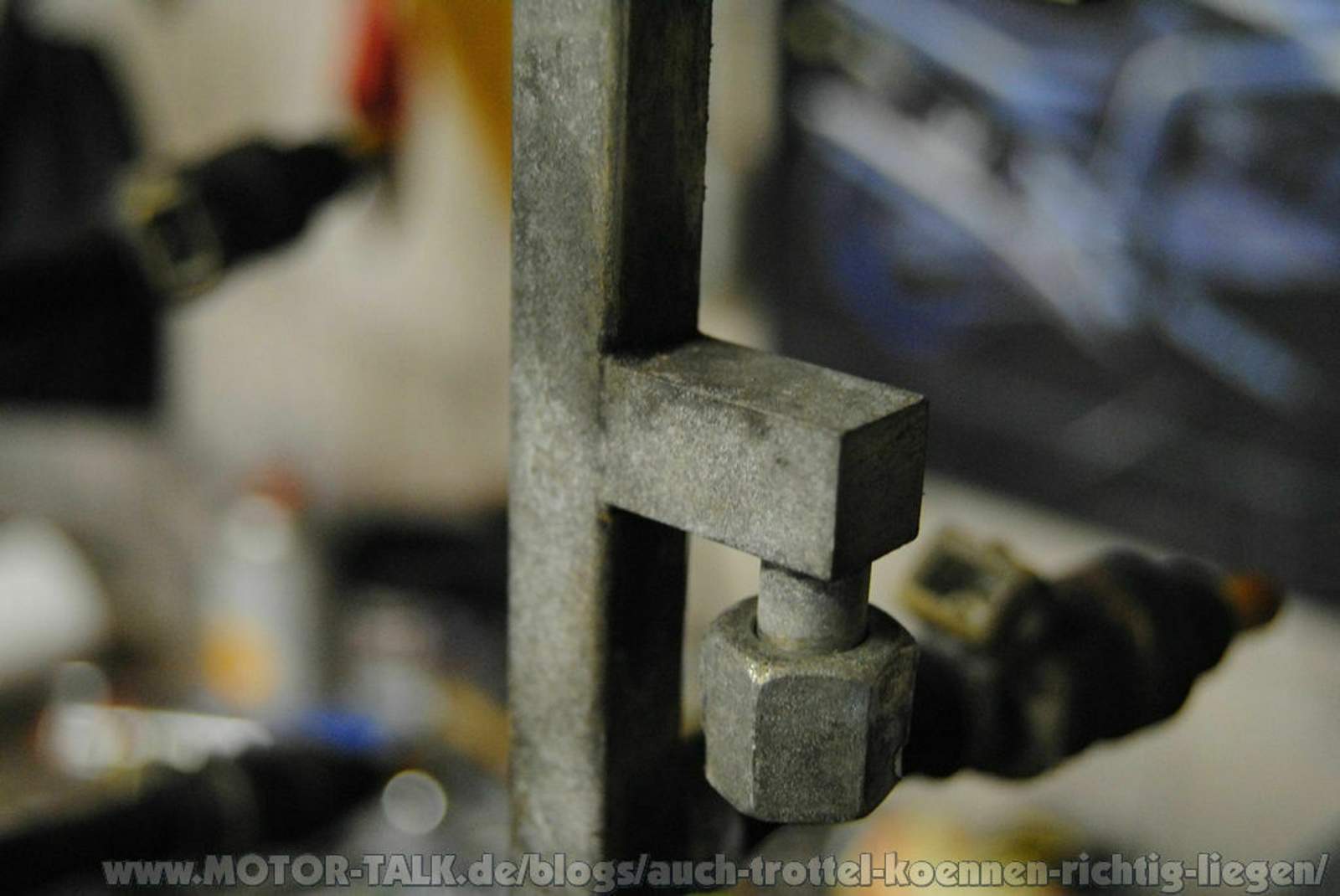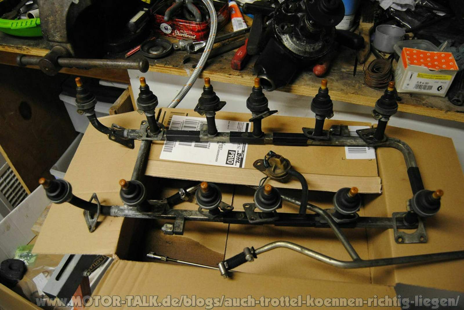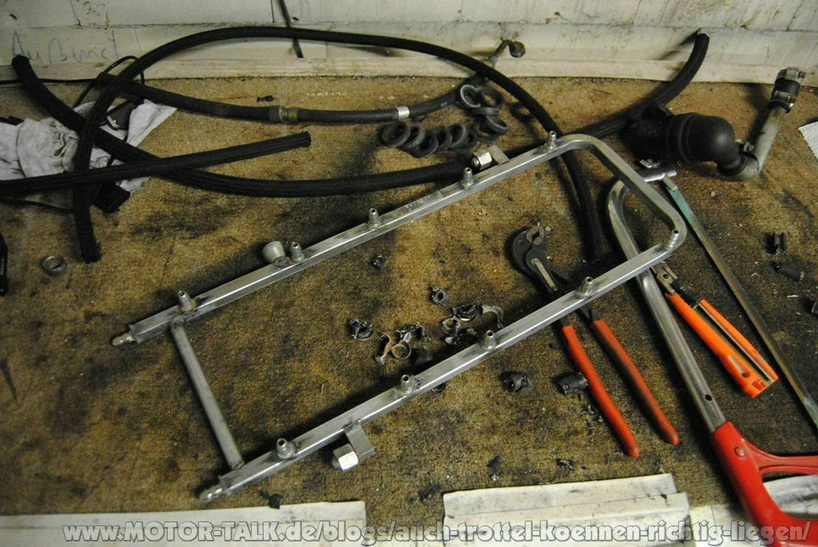 Zuerst gilt es, die Einspritzdüsen von der Einspritzrail (im Laufe der 20 Jahre, in denen der XJ-S gebaut wurde, gab es 4-5 verschiedene Varianten! Darum ist Ersatz teuer und selten!) zu entfernen. Da Jaguar gerne Presshülsen verwendet (geht ja flinker und effektiver), muss man eigentlich nur die Hülse selbst zerstören. Da ich aber dazu keine Lust habe, die Gummischläuche auch porös und defekt sind, reisse ich einfach die Ventile ab. Knack, ab. Knack, ab. Das Ganze 12 Mal