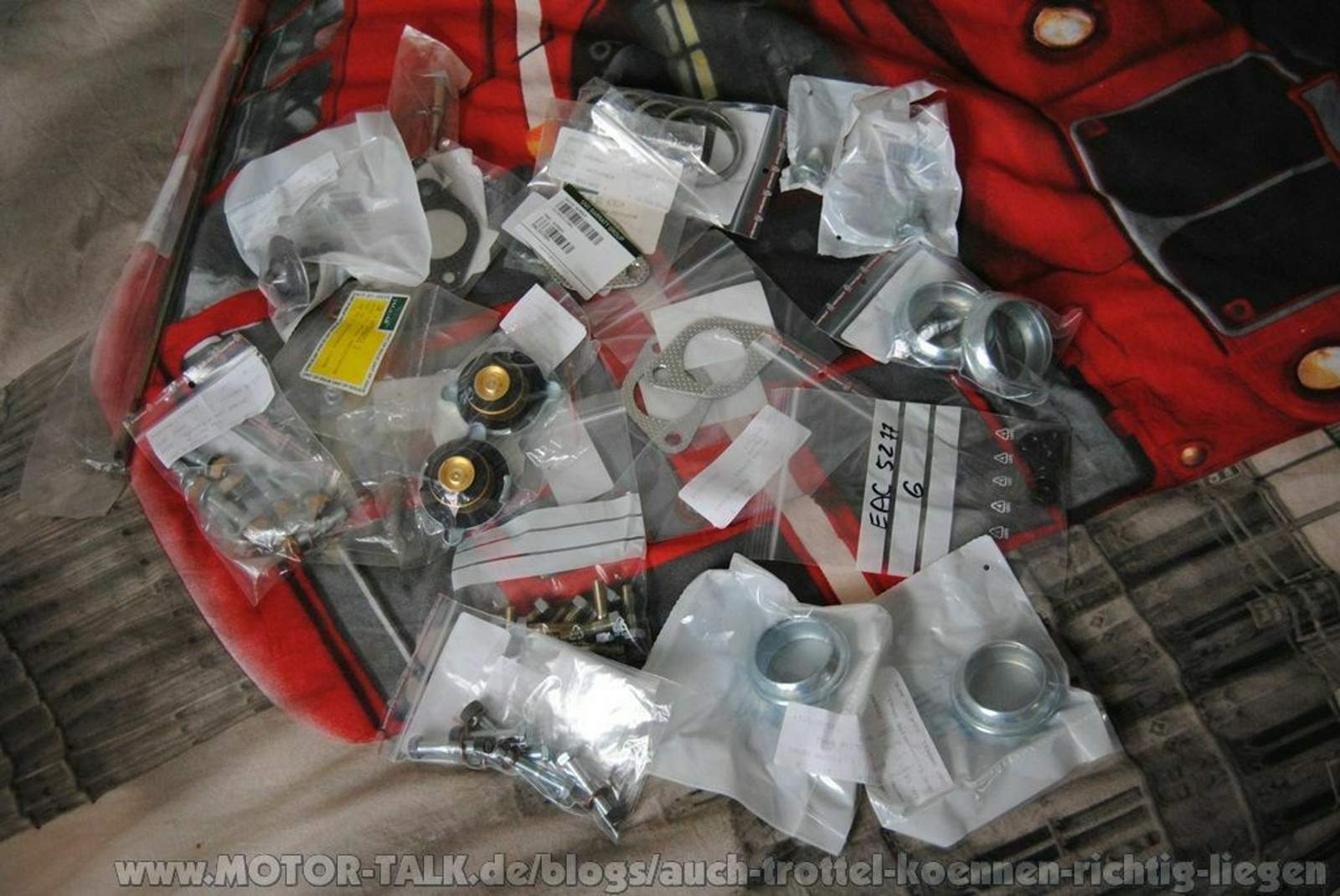 - 2 Austauschkrümmer (von Schrotti) für die Fahrerseite - 3 Krümmerdichtungen zwischen Kopf und Krümmer - 6 Stehbolzen für den Zylinderkopf mit Muttern und Kupferring - 4 Stehbolzen und Muttern für den Übergang von Krümmer zum Flammrohr - 2 Dichtringe für den Übergang von Krümmer zum Flammrohr - 1 Hitzeschild für die Fahrerseite - 1 Tube Wundheilsalbe für die Haut - 10 Pflaster in allen Größen