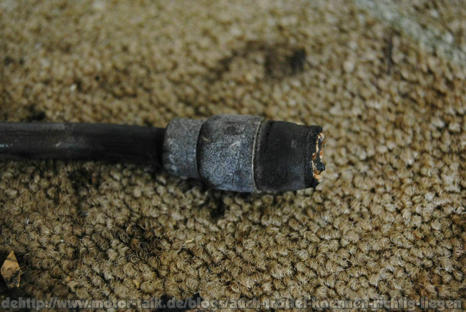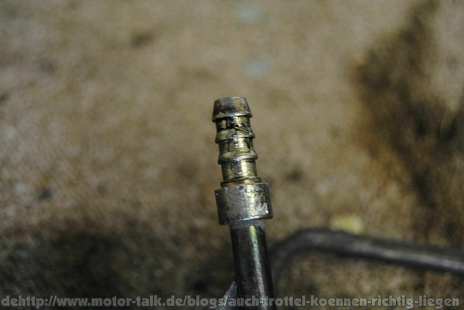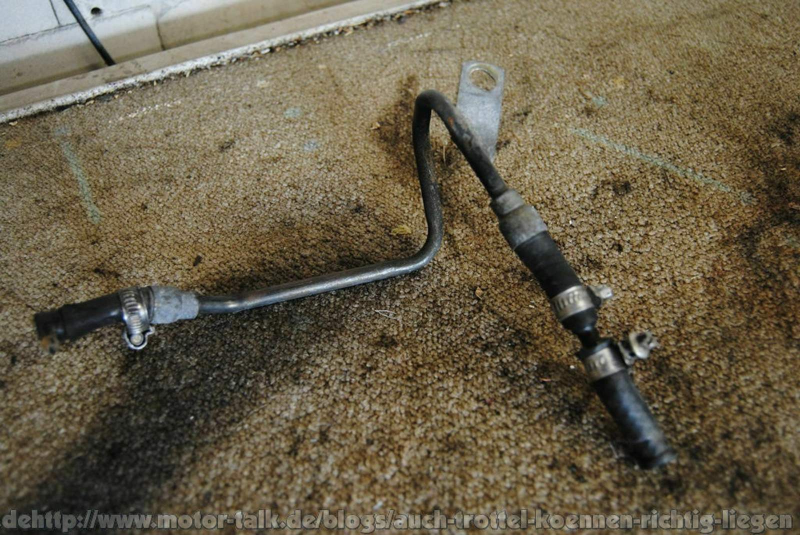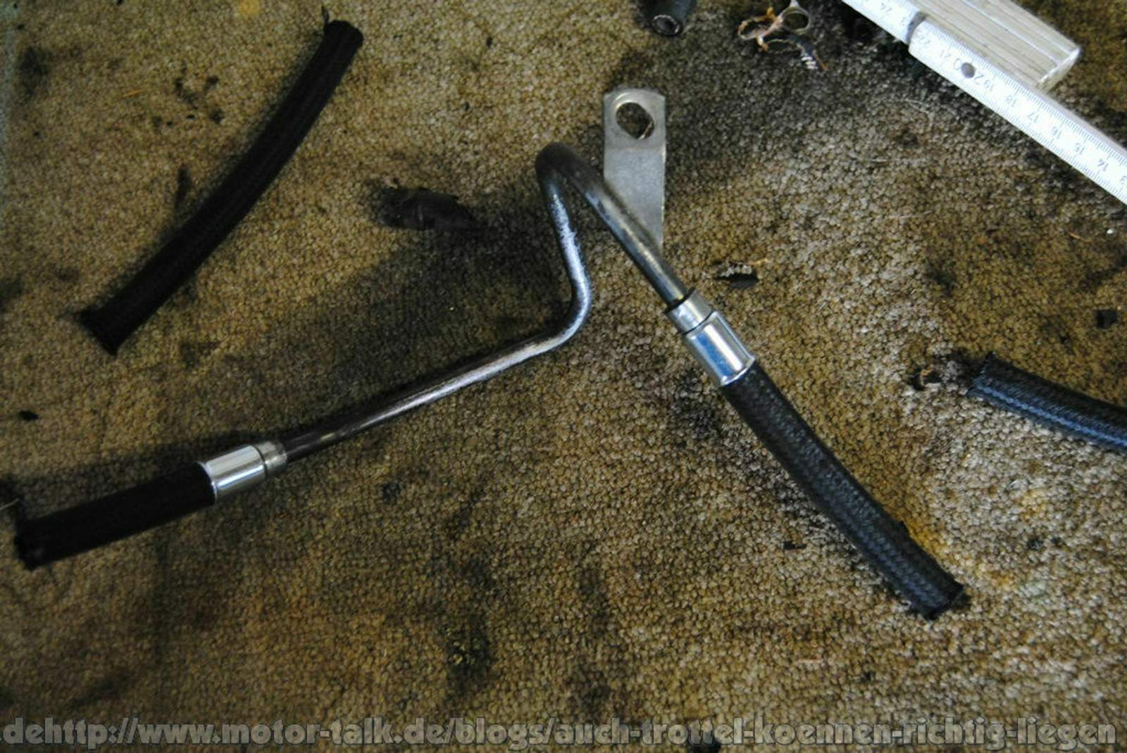 Naja, lustig ist es, dass der Hydraulikexperte der Meinung war, dass die Leitung verlötet war. Da ich kein Experte bin, habe ich das natürlich geglaubt. Aber das Ergebnis sehen wir oben. Neue Gummileitungen