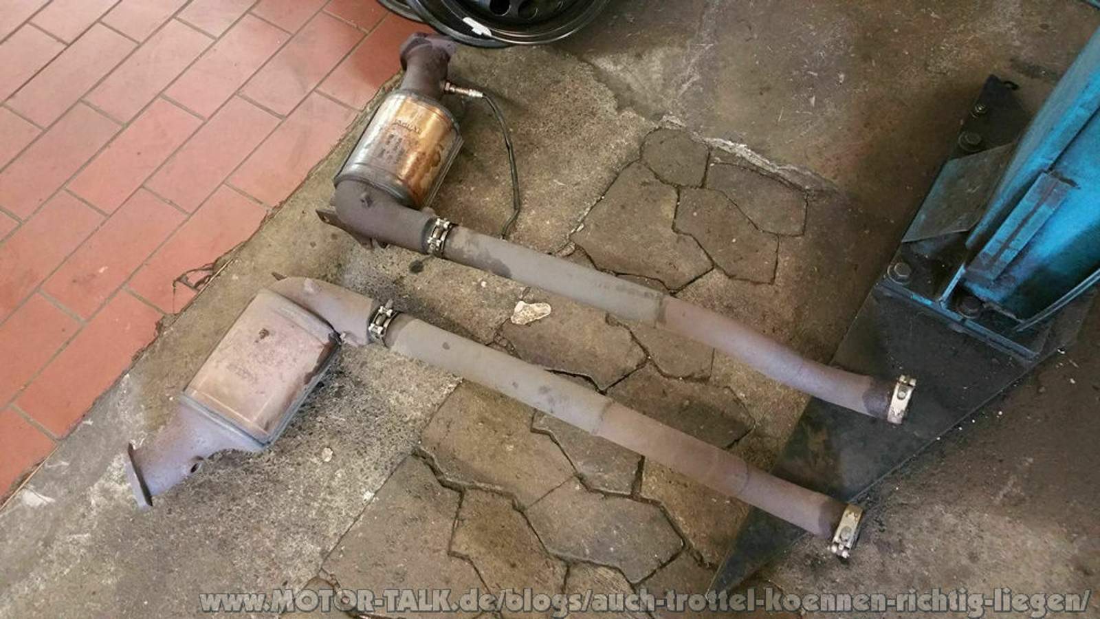 Um jetzt die Kats auszubauen, sind am Getriebe 2 Halter montiert. Diese sind mit 2 Schrauben pro Halter mit den Kats verbunden. 13 mm. Natürlich stark rostig ABER nicht schlimm. 3 davon gingen problemlos raus. Einer ist abgerissen. Stört mich erstmal nicht