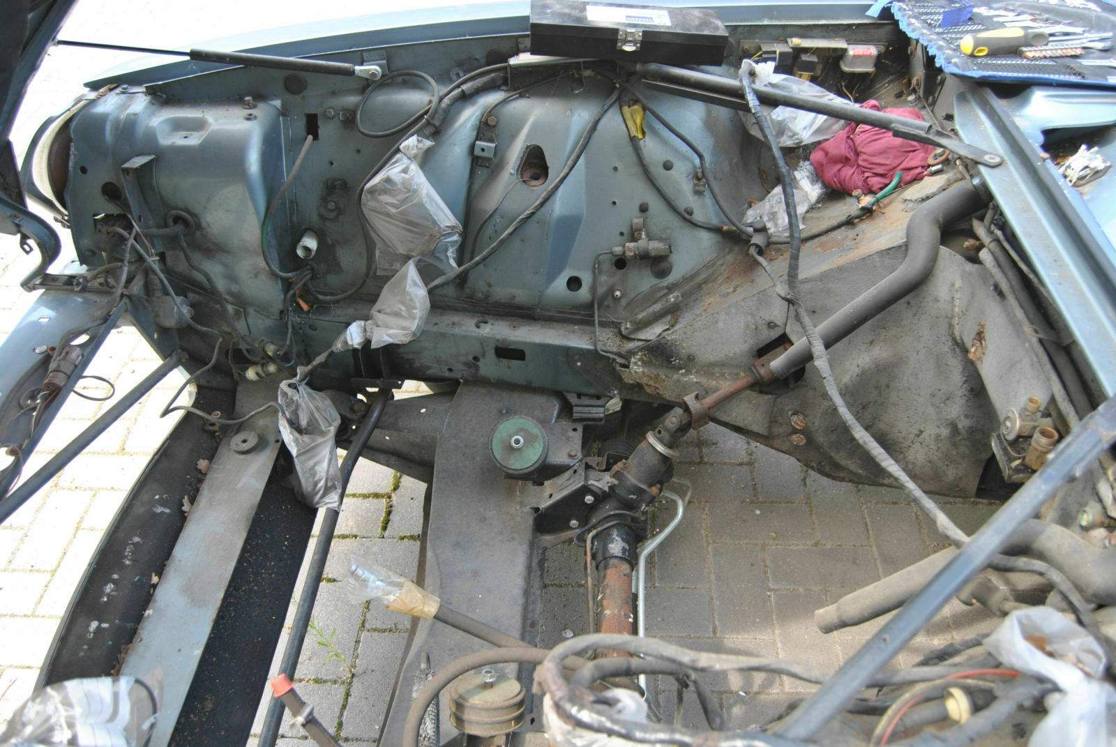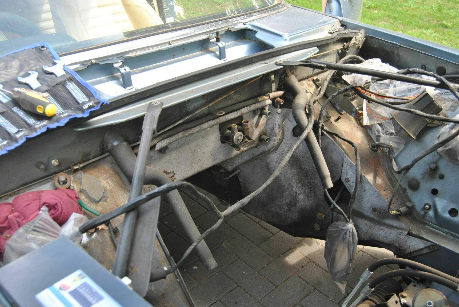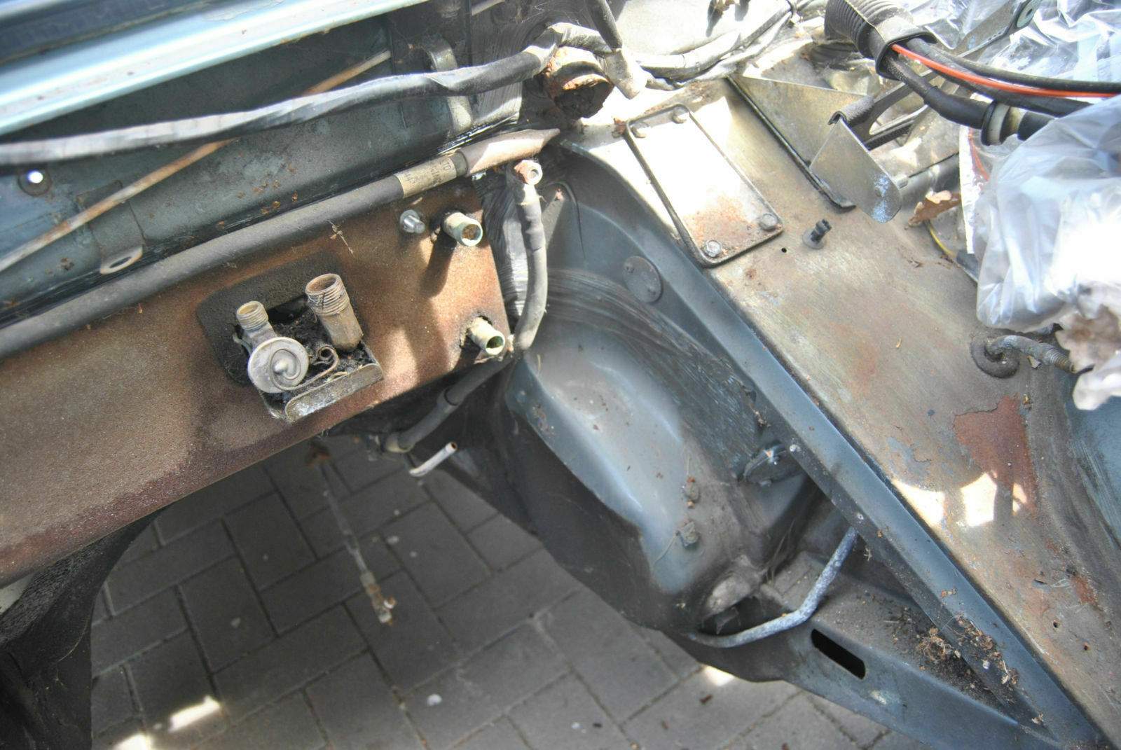 Durch etwas "Angstmacherei" meiner seits, habe ich mich immer wieder gescheut den genauen Zustand des Rostschadens an den Wasseraläufen im Motorraum zu beurteilen. Heute habe ich das gemacht und ich muss sagen, ich bin eigentlich begeistert. Die Abläufe sind zwar "fertig" aber die Spritzwand ist komplett unbeeindruckt. Finde ich klasse. Rusty war da durch.