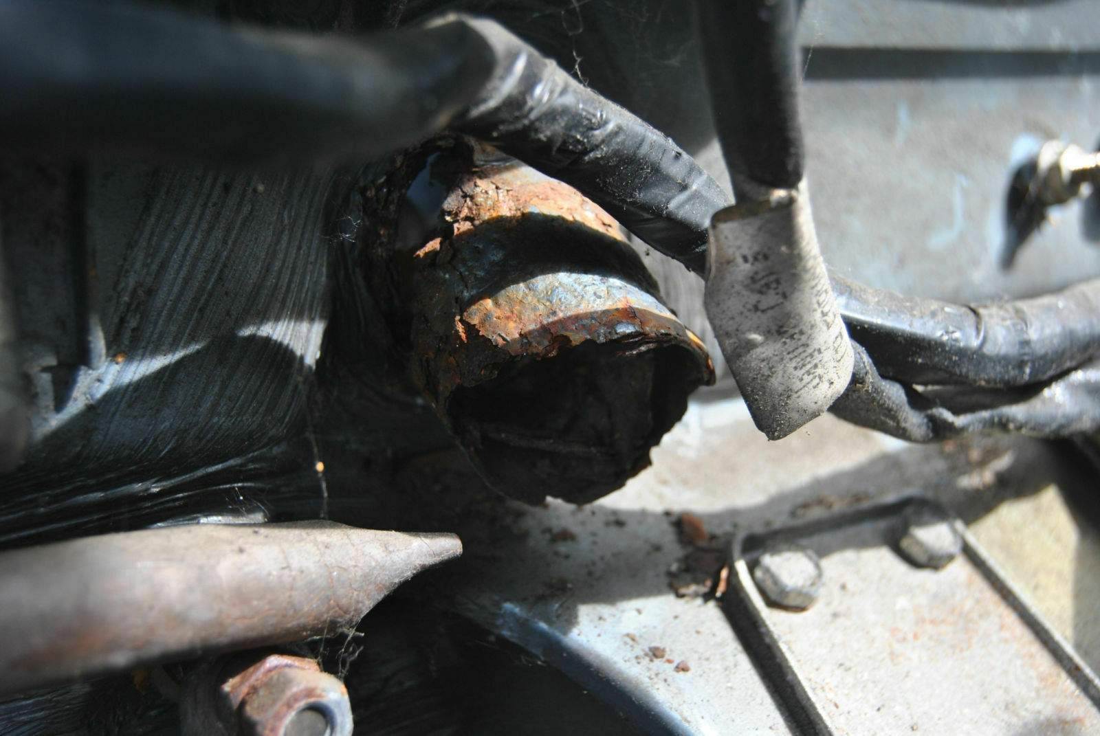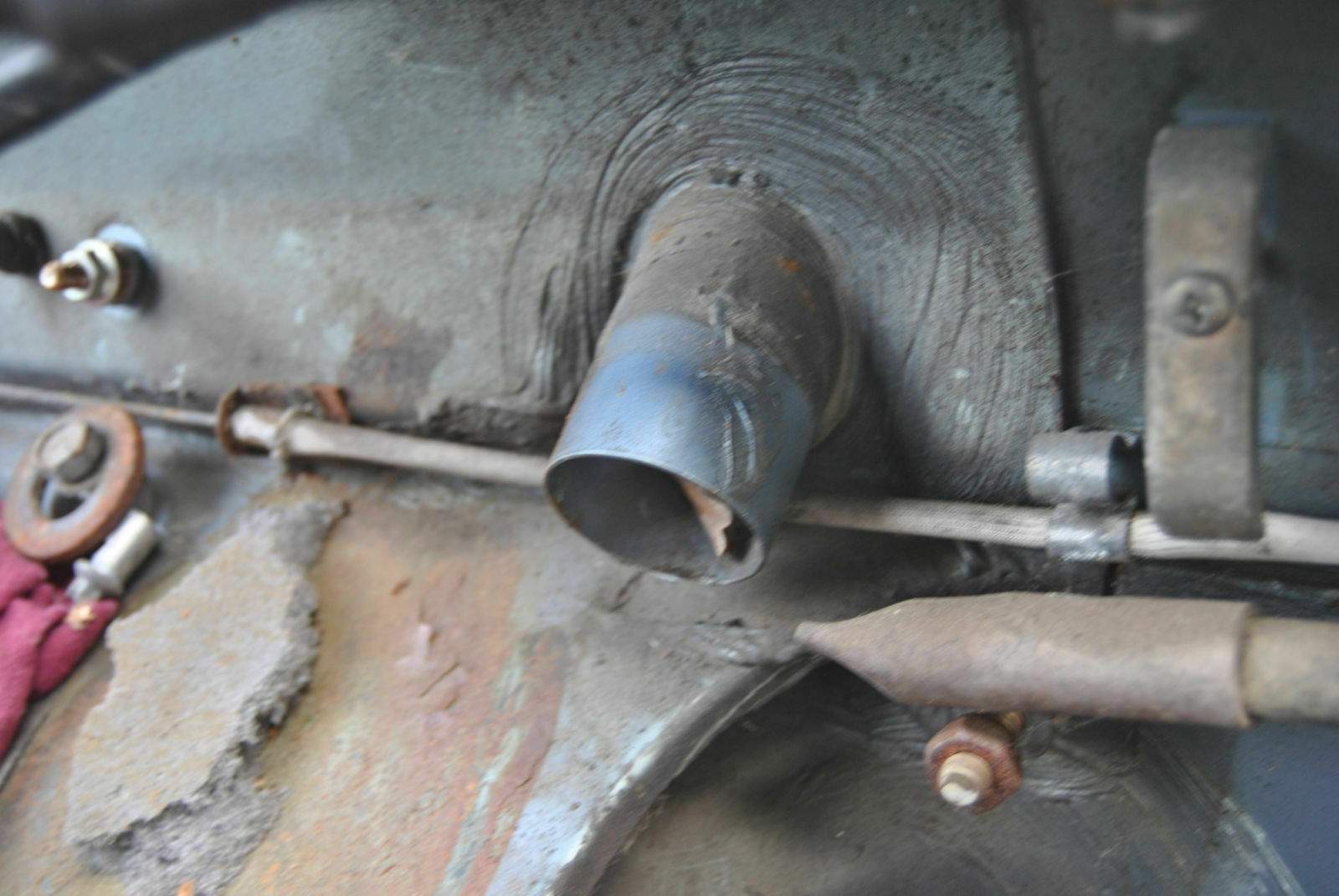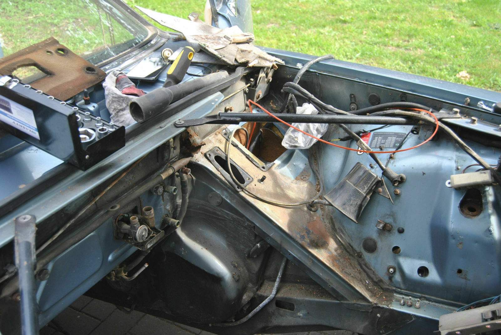 Durch etwas "Angstmacherei" meiner seits, habe ich mich immer wieder gescheut den genauen Zustand des Rostschadens an den Wasseraläufen im Motorraum zu beurteilen. Heute habe ich das gemacht und ich muss sagen, ich bin eigentlich begeistert. Die Abläufe sind zwar "fertig" aber die Spritzwand ist komplett unbeeindruckt. Finde ich klasse. Rusty war da durch.