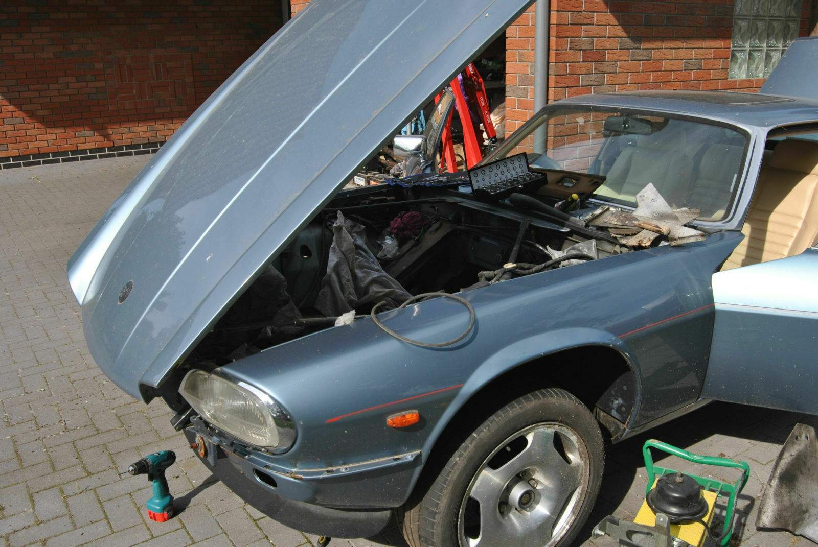 1. neue Abläufe aus einem ausgeschlachteten XJ-S besorgen. 2. Abläufe einschweissen lassen. 3. gebrauchte aber gute Hitzeschutzbretter besorgen und festnieten. 4. Motorraum wieder zusammenbauen. 5. Motor wieder einsetzen. 6. Motor vervollständigen. 7. Motor endlich wieder starten und hören. 8.