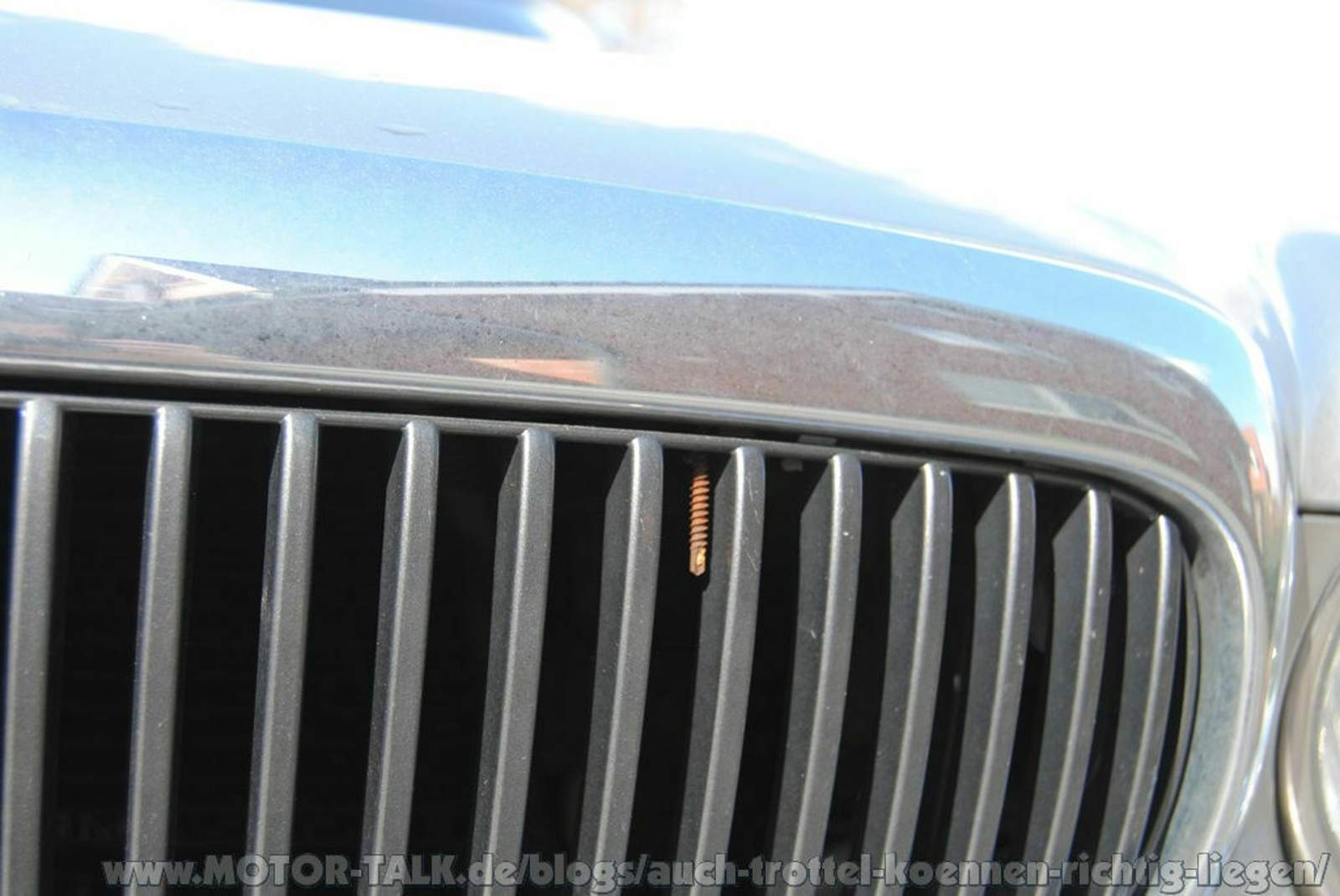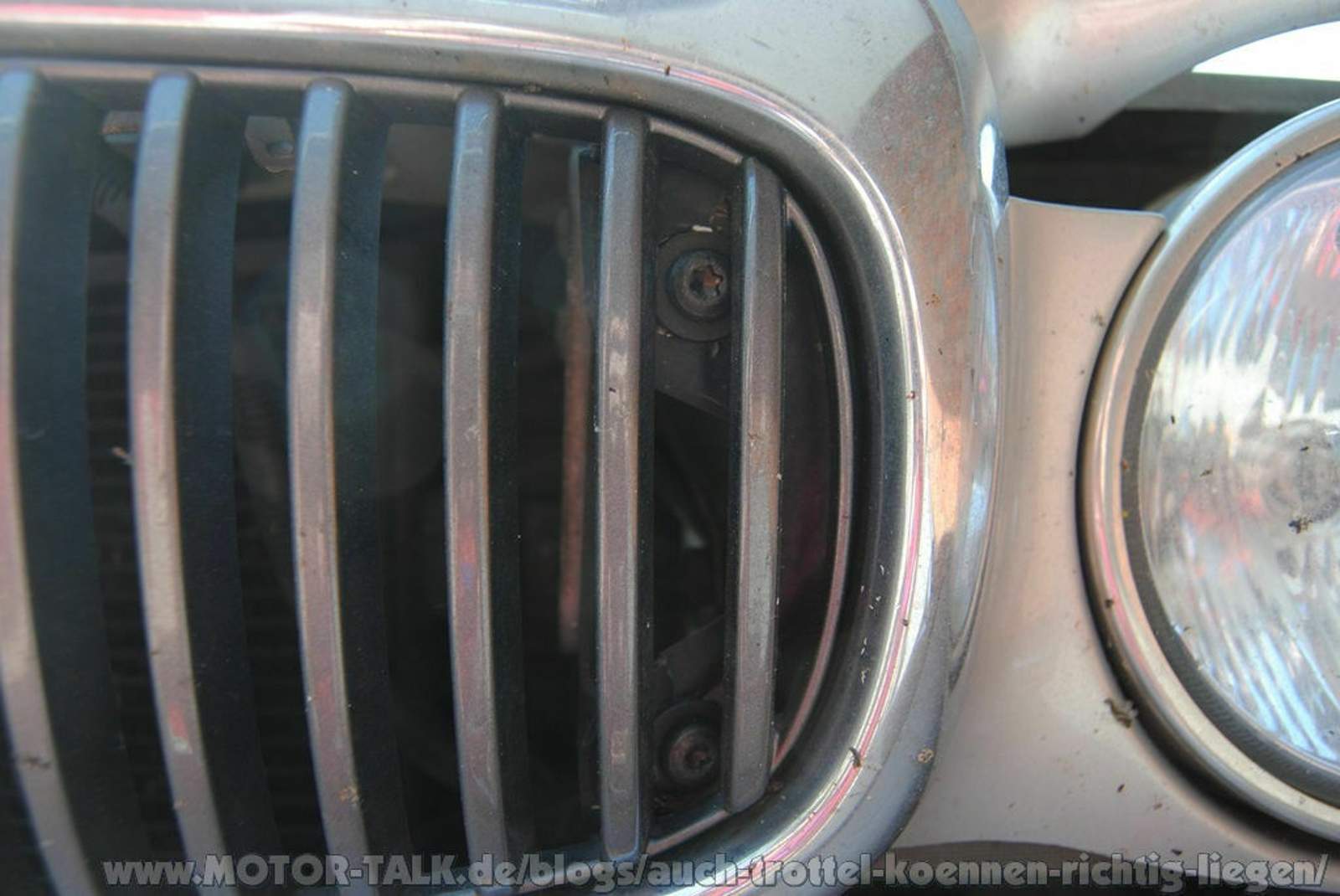 Der Vorbesitzer, der wohl den Unfall hatte, meinte es wäre sicherer, die Stoßstange mit Spaxschrauben am Grill zu befestigen. Ja, am Grill. Die Front ist also von 4 kleinen Schrauben abhängig, die in einem kaputten Grill gesetzt wurden. Der Grill selbst zeigte sofort, dass es nicht wirklich viel braucht um abzufallen! Egal, also, 4 Schrauben rausdrehen und dann auch die 4 schwarzen Torx Schrauben hinterm Grill, damit dieser auch entsorgt werden kann. Gräßlich!