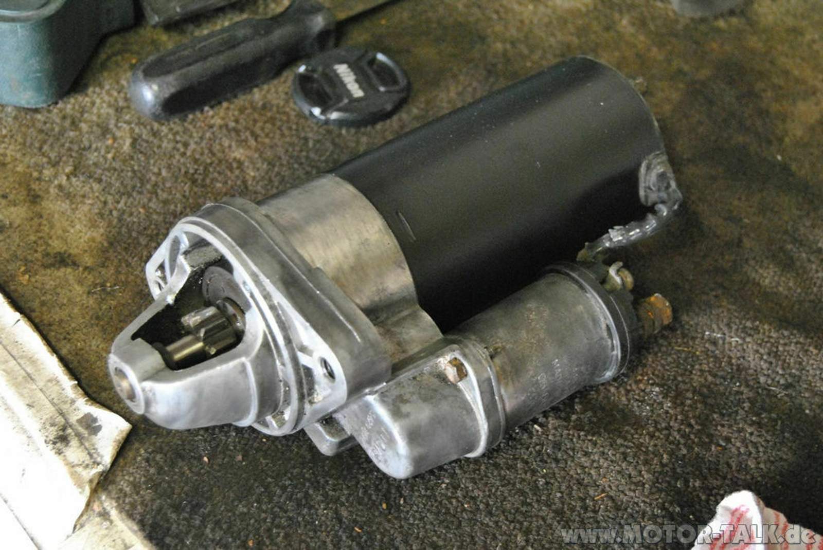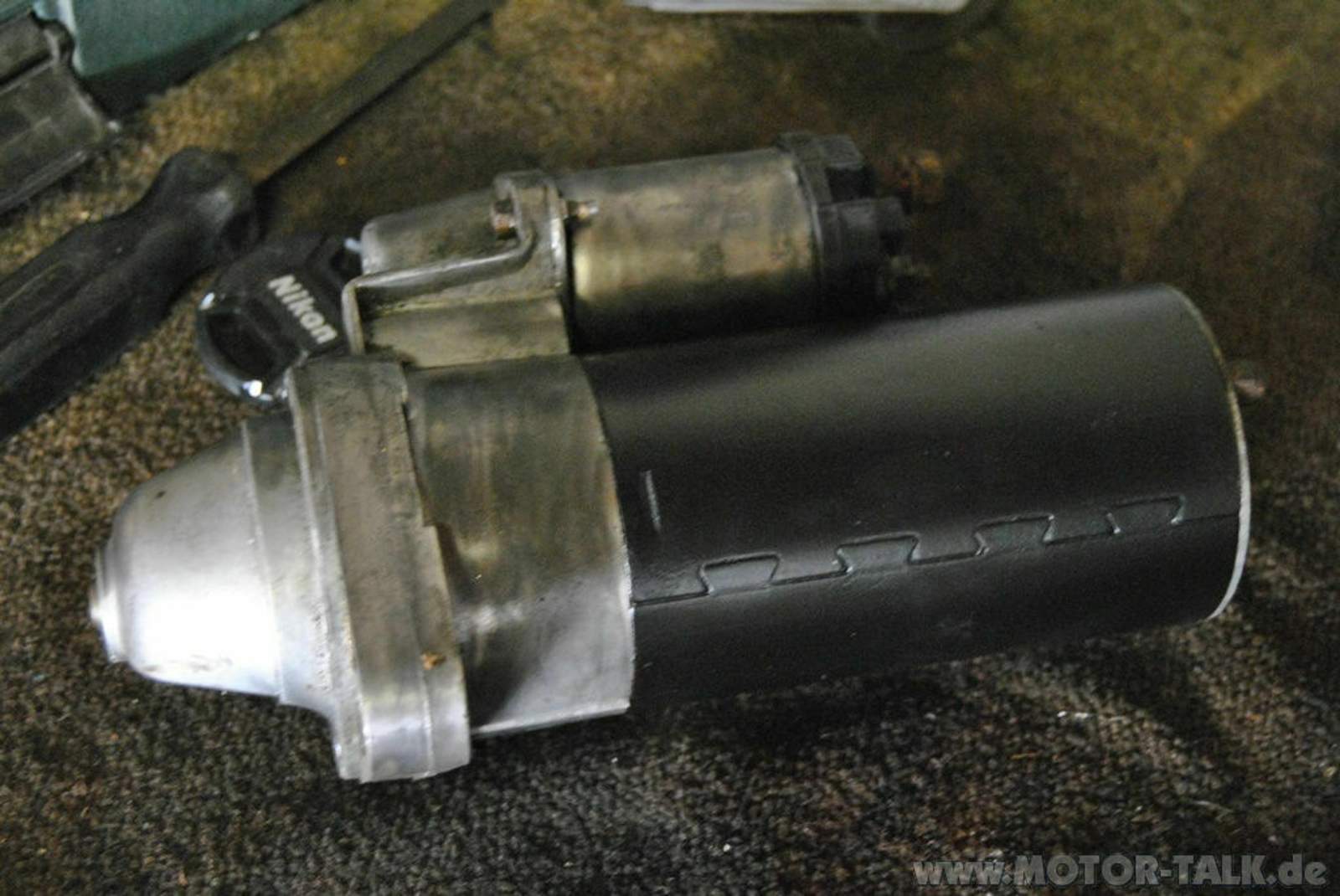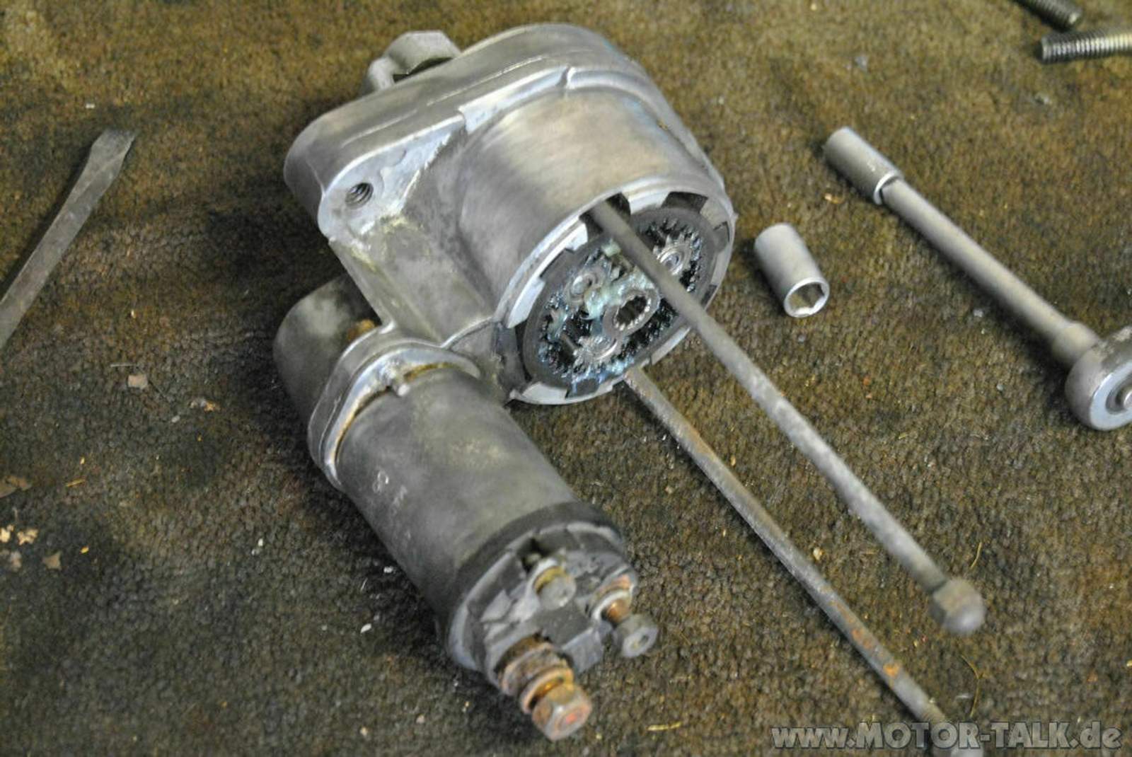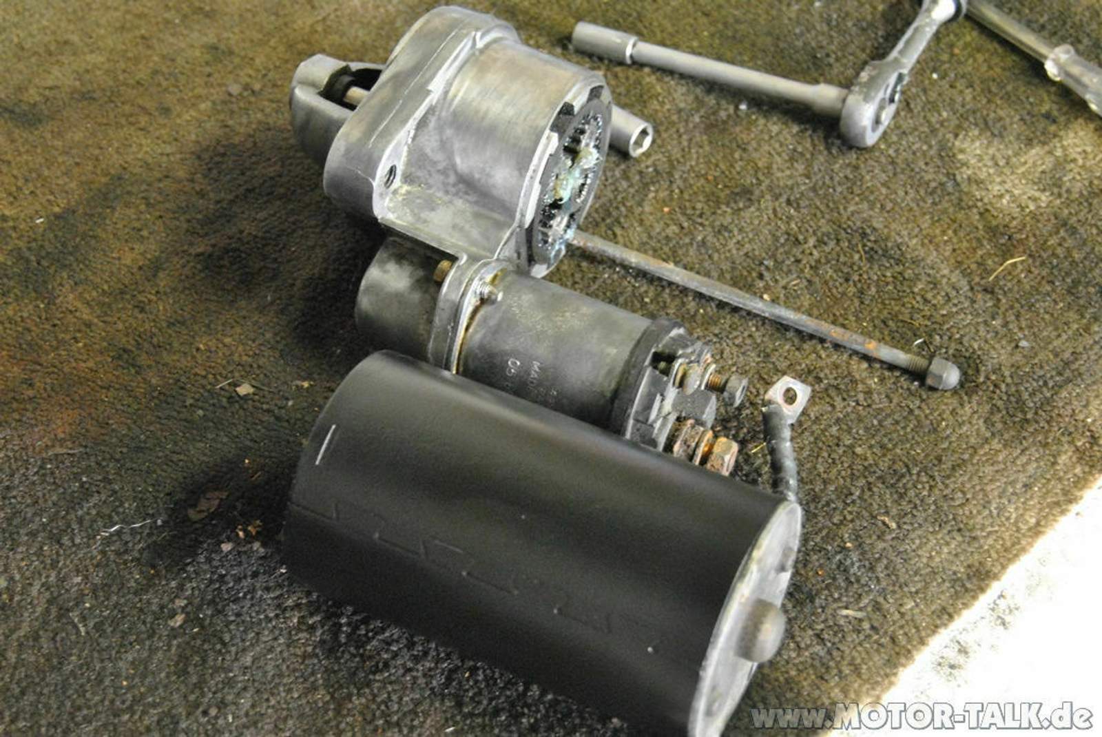 Motor abbauen durch Entfernen der beiden 10 mm Hutmuttern (die aber eigentlich lange Stäbe sind) am dicken Teil des Anlassers, danach den Motor vorsichtig abziehen. Den Magnetschalter kann man durch Lösen der beiden 8 mm Schrauben abziehen. Jedoch vorsichtig! Der Arbeitskolben (ist es ein Kolben? Keine Ahnung!) ist am Auswurfarm eingehakt. Vorsichtig seitlich abziehen und gut.