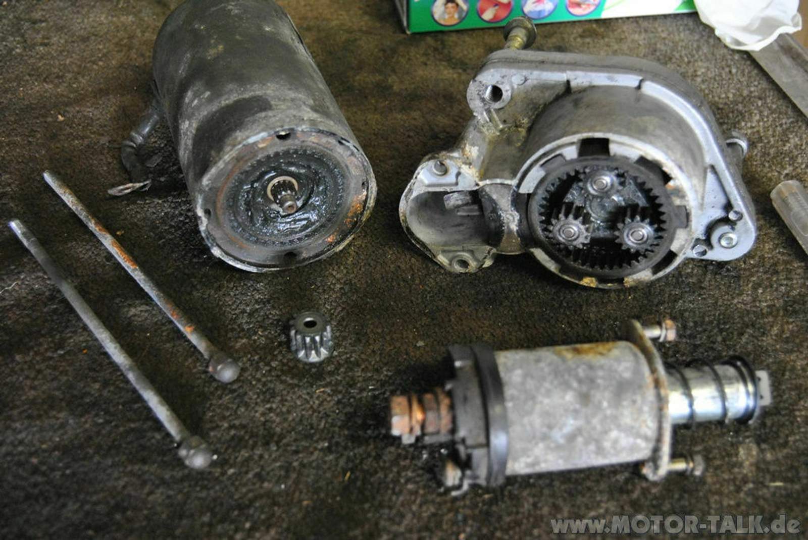 Den Rest können wir vom Schmodder und Gammel der vergangenen Jahre befreien. Motor entrosten (das Gehäuse) und das Gleiche am Magnetschalter. Etwas Glanz hat noch nie geschadet.