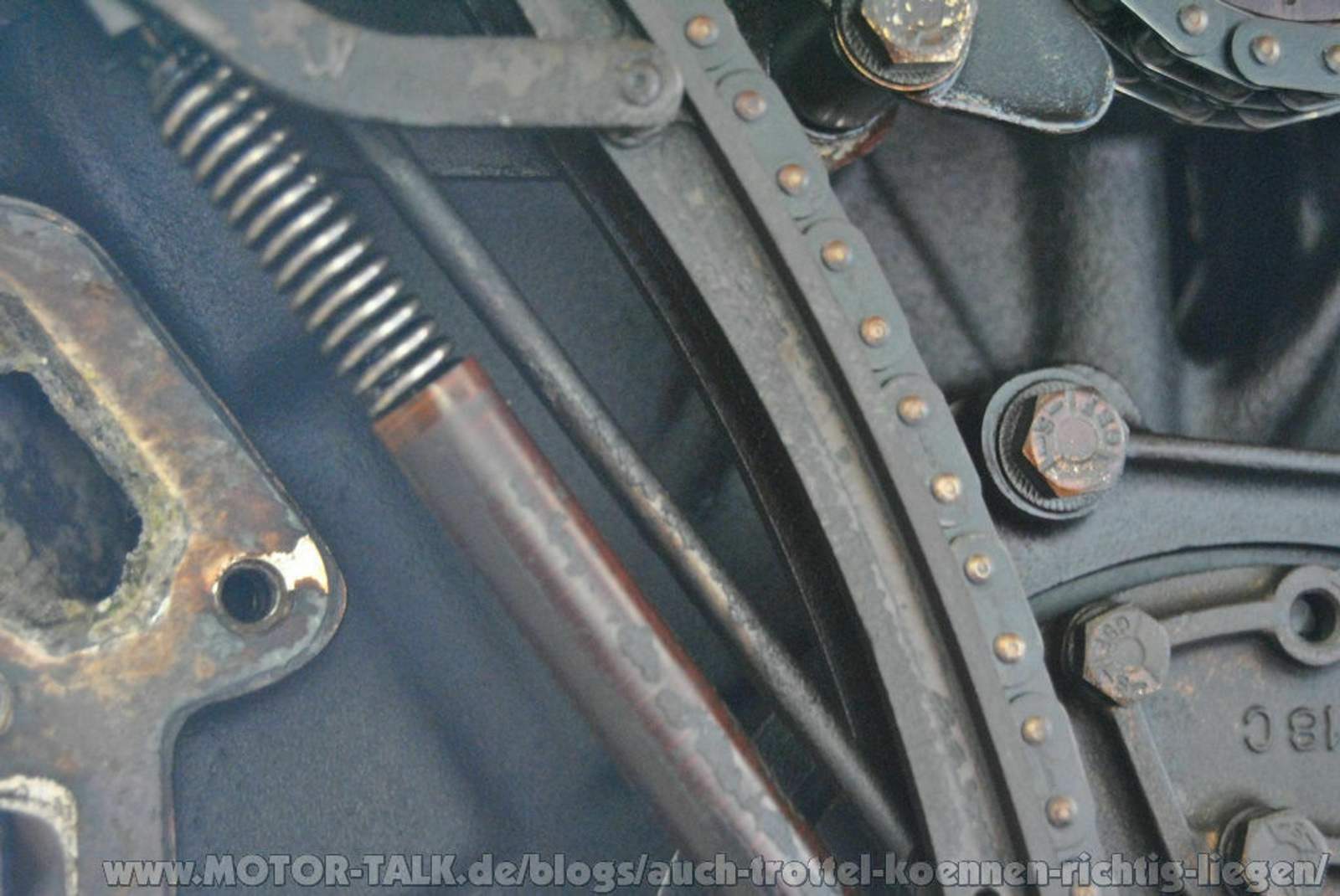 Das System ist insgesamt betrachtet etwas simpel für diesen Motor. Ich weiß aber nicht ob die Gefahr des überspringens der Kette besteht wenn die Feder bricht. Grundsätzlich scheint die Gefahr immer bei jedem Motor zu existieren. Dann wäre es eine heikle Sache und ein hydraulischer Kettenspanner angebracht.