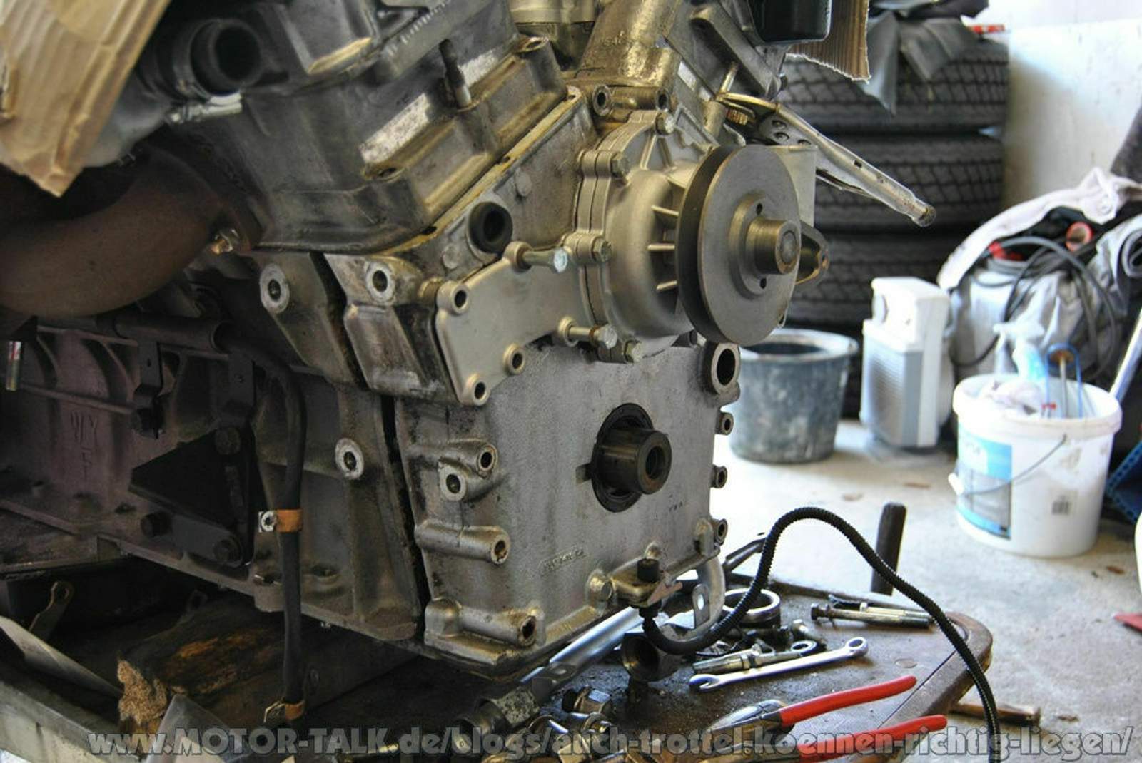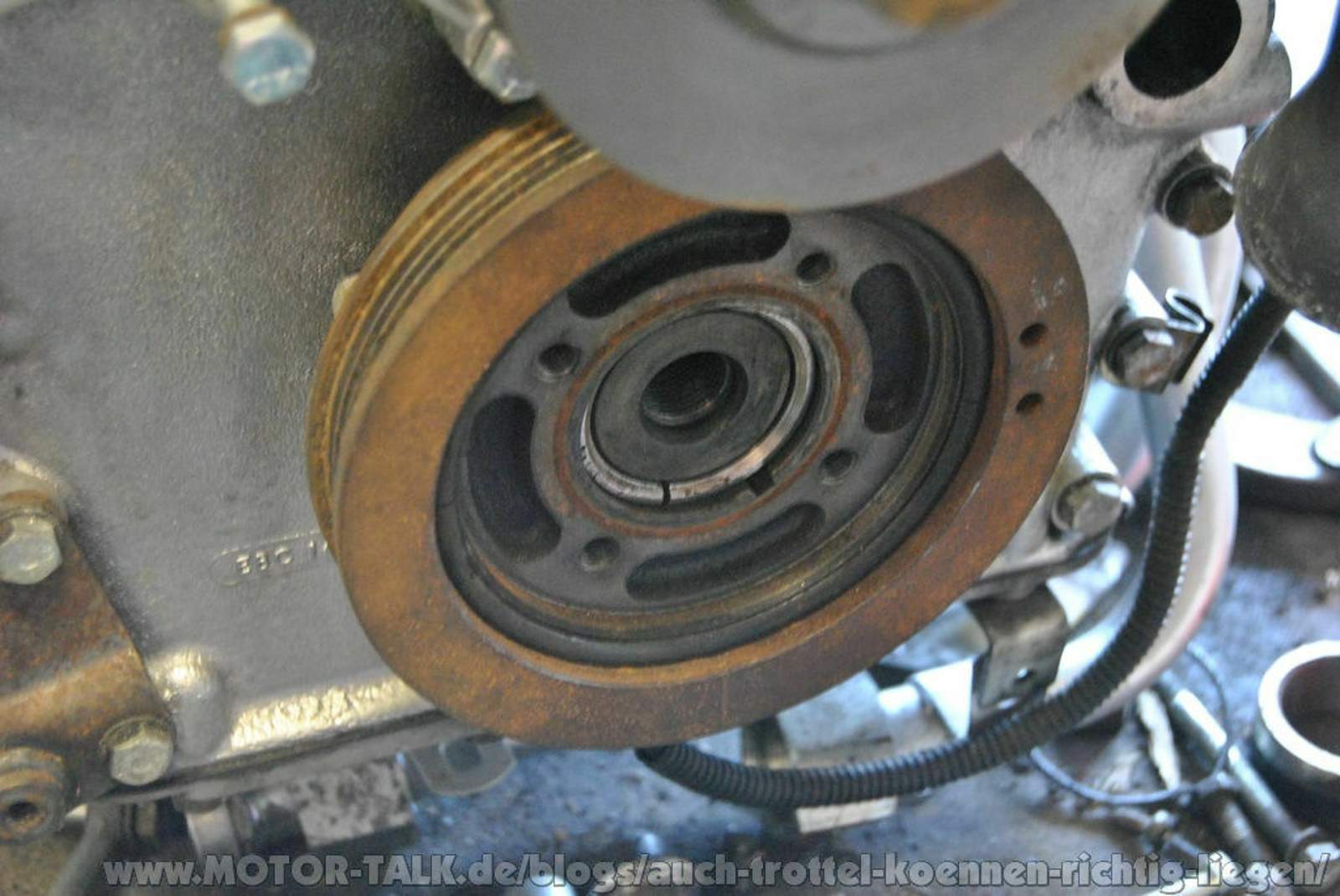 Fangen wir an, dazu nehmen wir die Riemenscheibe wieder ab. Das ist ziemlich einfach. Die Zentralschraube rausnehmen und damit ist das erledigt. Mit etwas "Mühe" die Riemenscheibe abziehen. Damit ist das dann erledigt... Dann noch das Bypassrohr (wieder). Naja, es wird nach und nach wohl wieder abgenommen und wieder angebaut werden. So langsam bin ich darin geübt!