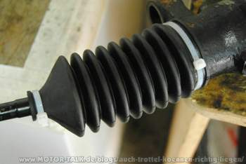Allerdings, so fest wie gesagt sind die Kabelbinder (wie original von Jaguar vorgegeben) nur am Gehäuse angebracht. An den äußeren Stellen nur "leicht" festgezogen, damit ich, wenn die Spurstangenköpfe drauf sind, die Faltenbälge nicht in sich verdrehe und damit wieder aufreissen.