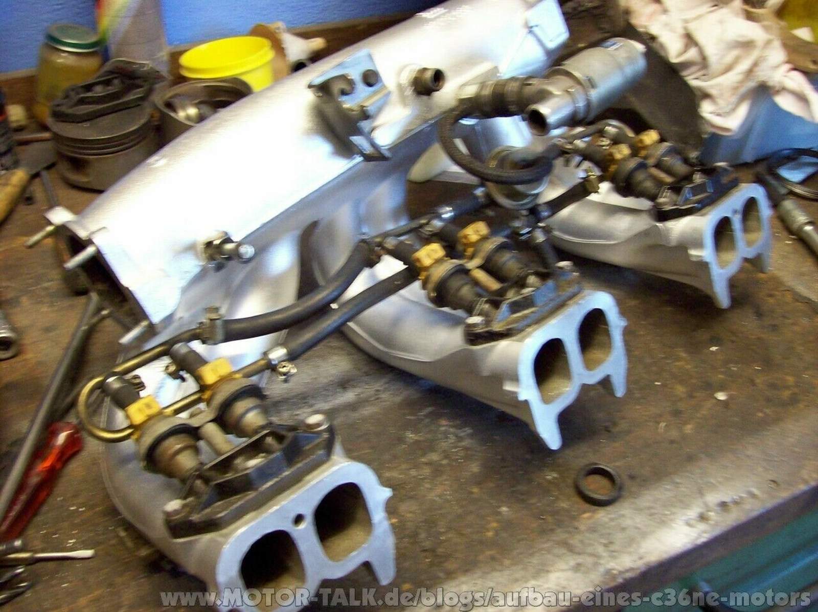 KW 41 (08. 10 bis 13. 10. 2012) Die Einspritzdüsen werden mit neuen Gummis in die Adapterplatten eingesetzt, und anschließend an das Saugrohr geschraubt. Es folgt der Leerlaufregler, der Anschluss für den Bremskraftverstärker, der Halter für die Gaszüge und die Umlenkung für die Drosselklappenbetätigung (Bild 77).