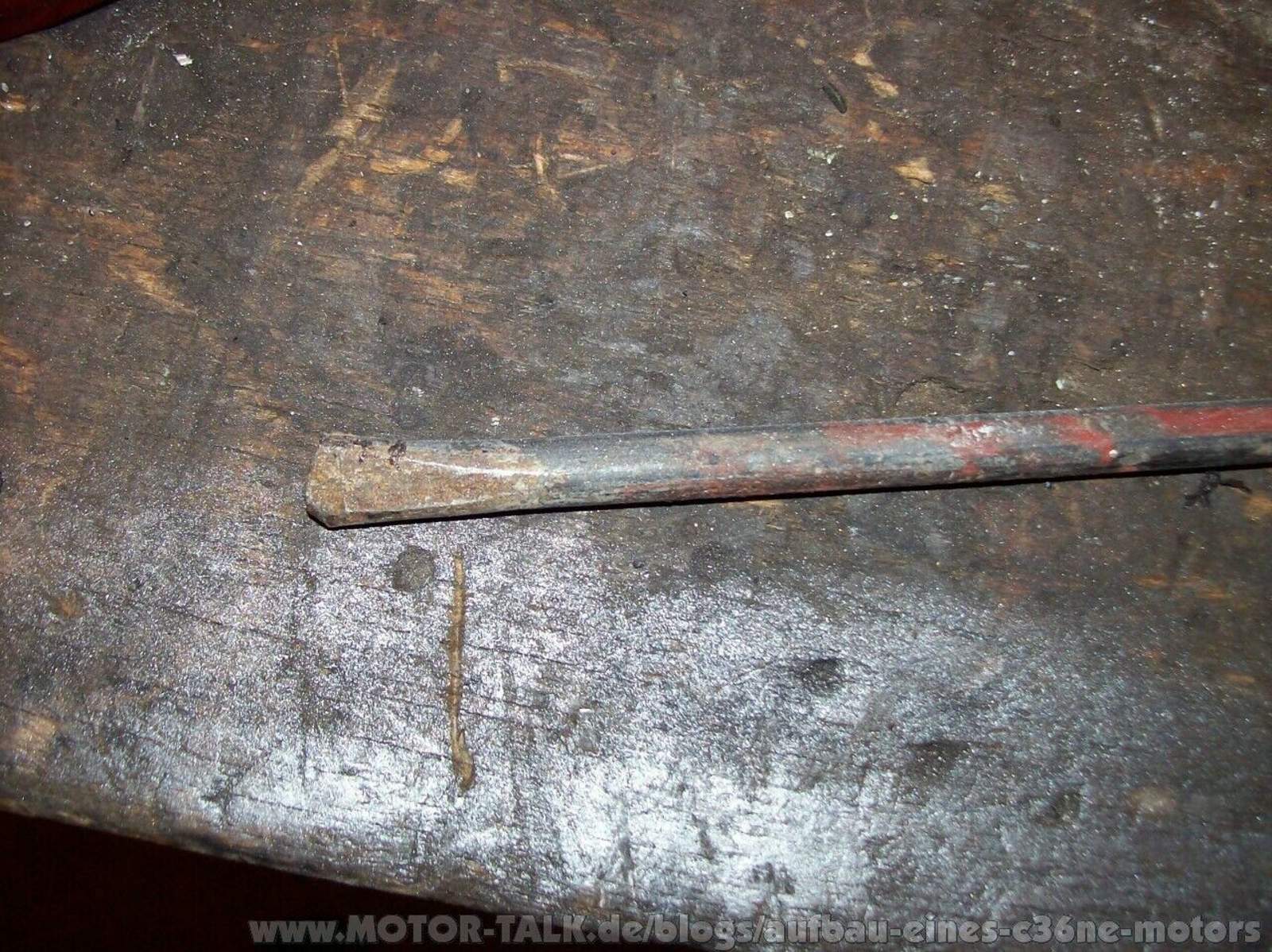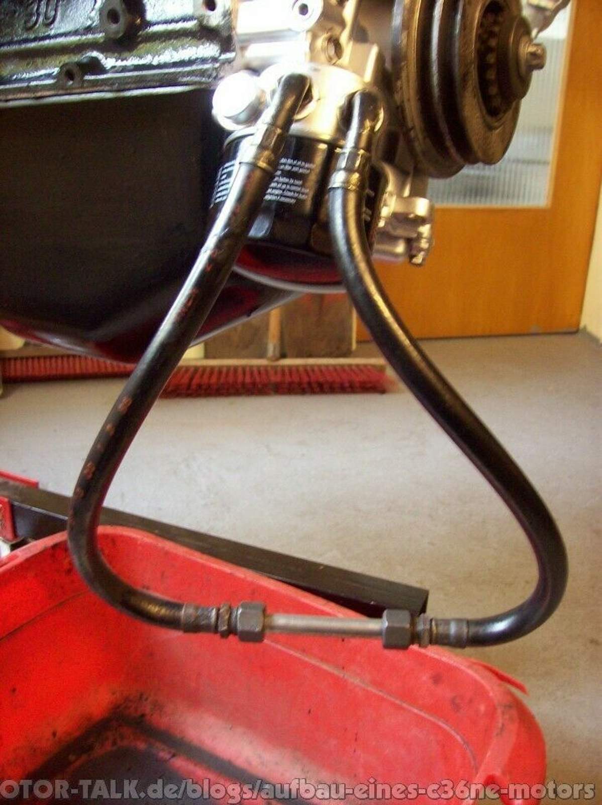 Anschließend wird das Saugrohr an den Motor locker angesetzt und dann inklusive der Auslasskrümmer mit 35 Nm von innen nach Außen angezogen. Dann wird das Hitzeschutzblech montiert (Bild 78). Als nächstes werden 5 Liter Motoröl in die Wanne gegossen. Dann habe ich ein Stück Rundstahl an einer Seite etwas angeflacht damit ich die Ölpumpe mit einer Bohrmaschine antreiben kann (Bild 79). Um Öldruck im Motor aufzubauen, muss ich, da ich keinen Ölkühler habe, am Ölfilter-Adapter einen Kurzschluss bauen (Bild 80). Nun läuft die Bohrmaschine solange bis blasenfreies Öl aus den Kanälen im Zylinderkopf kommt (Bild 81 - 82). Danach wird der Ventildeckel montiert. Jetzt ist der Motor soweit fertig und kann in ein Fahrzeug eingebaut werden (Bild 83). Als nächste folgt die Komplettierung mit Lichtmaschine, Lenkhilfspumpe und Zündverteiler. Das hat allerdings Zeit. Lichtmaschine und Lenkhilfspumpe werden von meinem Omega übernommen, da ich den Motor von Keilriemen auf Flachriemen in den Wintermonaten umbauen werde. |