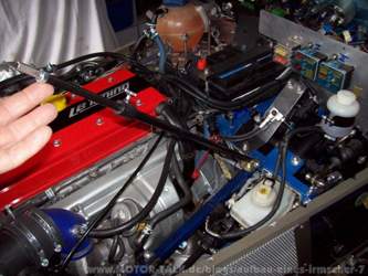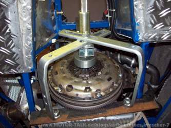KW 08 (21. 02. 2011 bis 26. 02. 2011) Die beiden hinteren Getriebehalter wurden Abgetrennt, und es wurden neue Halter Konstruiert (Bild 306) und nach dem Erneuten Einbau des Getriebes festgeschraubt (Bild 307). Das Getriebe wurde mit List, Tücke, Schweiß und Flüche ausgebaut. Schuld daran waren die nicht gerade üppigen Platzverhältnisse. Als wir die Druckplatte abschraubten, kam uns das Spiel des Zweimassenschwungrades sehr suspekt vor. Wir bauten es aus, und zeigten es unserem Opelhändler. Ergebnis: Schwungrad ist defekt es muß ein neues Eingebaut werden. Kosten für das Schwungrad: ca. 900.- Euro. Als wir das neue Schwungrad und die Befestigungsschrauben hatten, wurde die Schrauben mit Loctite eingedreht und das Schwungrad mit 65 Nm + 30° + 15° angezogen. Danach wurde die Mitnehmerscheibe und Druckplatte auf die Schwungscheibe lose angeschraubt. Jetzt kam das Montagewerkzeug zu Einsatz. Es wurde an dem Motorblock befestigt. Die unteren Befestigungsarme konnten wegen der engen Platzverhältnisse nicht am Motorblock angeschraubt werden. Wir nahmen ein starkes Flacheisen, bohrten zwei Löcher an den vorher markierten Stellen und blockierten das Schwungrad gegen Verdrehen. Jetzt konnte die Kupplung nieder gedrückt und die Schrauben mit 15 Nm über Kreuz angezogen werden. (Bild 308). Vor dem Einbau des Getriebes haben wir einige Versteifungsrippen gekürzt, damit das Getriebe besser eingesetzt werden kann. Nachdem das Getriebe eingebaut war, wurde die Kardanwelle, die Tachowelle, die Kupplungsbetätigung und das Schaltgestänge angeschlossen. Jetzt sind noch einpaar Kleinigkeiten zu bewerkstelligen wie Kupplung entlüften, die Mittelkonsole, den Batteriekasten und die Batterie einbauen. Wenn alles erledigt ist, wird der Motor zu einem Probelauf gestartet. |