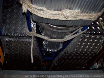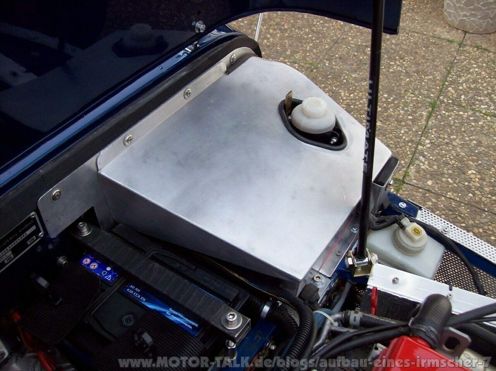 KW 17 (26. 04. 2011 bis 30. 04. 2011) Bei einer Diskussion stellte sich heraus, dass der Tank nicht fest mit der Karosserie verschraubt werden durfte. In der Richtlinie 70/220/EWG wurde dies bestätigt. Deshalb wurden umgehend die Haltewinkel und Verschraubungen entfernt. Es wurden zwei Spannbänder hergestellt, die den Tank dreiviertel umschlingen und festhalten (Bild 321). Über den Zentralstecker wurde eine Abdeckung angebracht (Bild 322). |