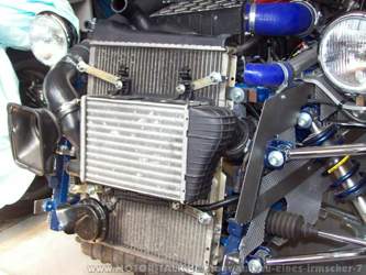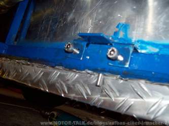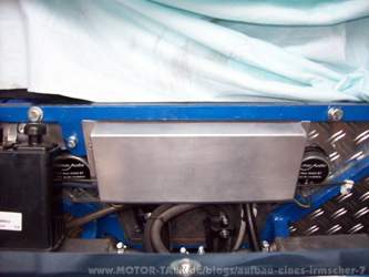 KW 21 & 22 (23. 05. 2011 bis 04. 06. 2011) Es werden einige Kosmetische Korrekturen durchgeführt. Der Abstand zwischen dem Ventilator und Kühler ist etwas zu weit. Es wird deshalb ein neues Blech angefertigt, damit der Abstand verringert wird. An die hinteren Kotflügel wird ein transparenter Steinschlagschutz angebracht. |