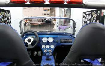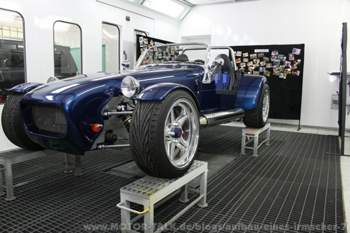 KW 19 (09. 05. 2011 bis 14. 05. 2011) In dieser Woche am 12. 05. steht die Präsentation des Super Seven bei VM in Bergisch Gladbach an. Wir beide sind sehr gespannt wie das Ergebnis ausfällt. Dazu wurde von einem Bekannten einen mit Planen bespannter Trailer besorgt. Als Zugfahrzeug hat uns die Firma Grimm ihren Vivaro zur Verfügung gestellt (Bild 324). Bei VM angekommen wird der Seven auf eine Hebebühne gestellt (Bild 325). Danach wird der Wagen sehr penibel untersucht. Dabei entstand ein reger Erfahrungsaustausch, und es wurden uns von Seiten VM Tipps gegeben die das Fahrzeug noch verbessern. An dieser Stelle müssen wir der Firma VM für die sehr gute fachliche, kompetente und konstruktive Unterstützung beim Zusammenbau unseres Seven bedanken. Danach wurde der Seven wieder auf den Trailer geladen und wir sind in Richtung Heimat gefahren.