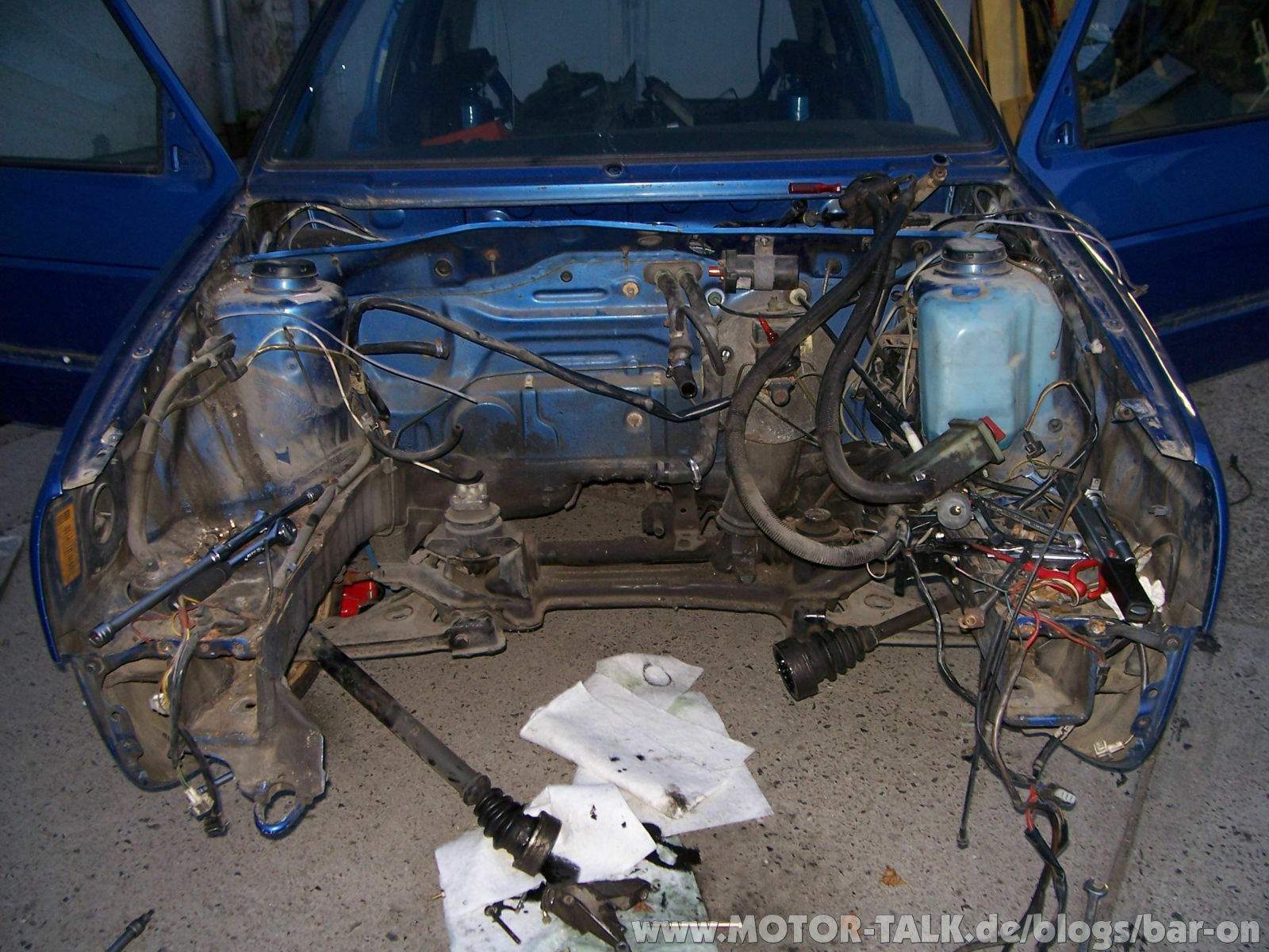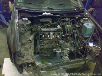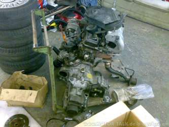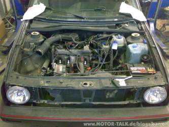 - Antriebswellen festschrauben - Motorlagerschrauben festziehen - Ein paar Kabelbäume anschließen (Batterie, Anlasser, Lichtmaschine) - Hosenrohr und Kat montieren - Spritpumpe und - Schläuche vom Schlachter holen und in meinen Golf einbauen. - Ölpumpe vom alten Motor und ein Schwallblech einbauen, erstmal 15 W 40 rein - Die ganze Geschichte zum Laufen kriegen! - Motorspülung, Ölwechsel mit Filter.