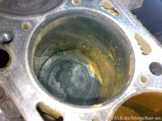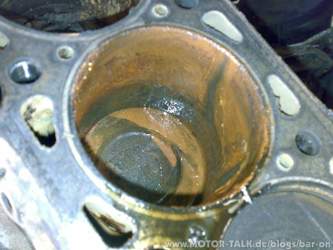 Als der Kopf dann runter vom Block war, traf mich fast der Schlag! Die mittleren beiden Kolben waren festgerostet. Und auf ihnen stand noch ordentlich Wasser (Naja, wenigstens scheinen die Kolbenringe noch gut gewesen zu sein...). Teilweise hatte sich der Rost schon richtig tief in den Block gefressen! Aber ich lass mal lieber Bilder sprechen: