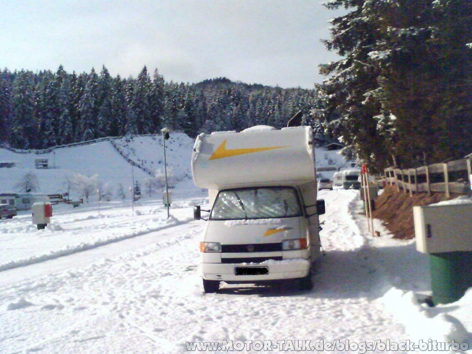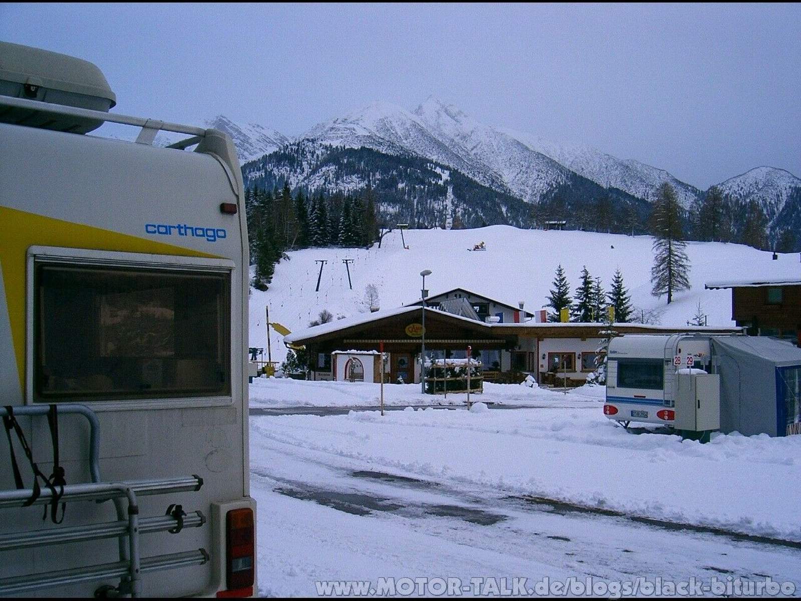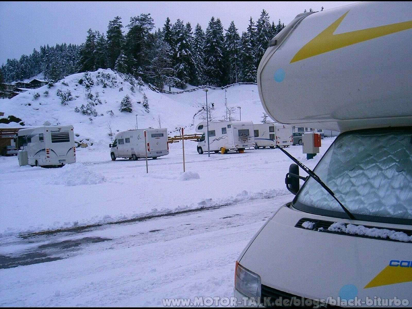 Zur Anfahrt: Naja, den Zirlerpass hoch mit einem 78PS WoMo mit vollen Tanks und allem möglichen Zubehör ist nicht so lustig - teilweise ging es nur noch im 2ten gang mit 25km/h. Da ich ja ein netter Mensch bin, bin ich an einer sehr ordentlichen Steigung an einer Haltebucht rausgefahren um die Schlange vorbeizulassen und das war ein Fehler! Das anfahren bei etwa 16% Steigung war nicht ganz einfach (und hierbei würde ich sagen, dass die kontrollierte Kernfusion eher als einfach zu beschreiben ist). Aber es ging. In Seefeld habe ich dann meine ersten Erfahrungen mit einem nicht ABS Fahrzeug auf verschneiten Straßen machen können - und ich muss sagen es geht. der Goodyear Vector hat eine gute Figur abgegeben.