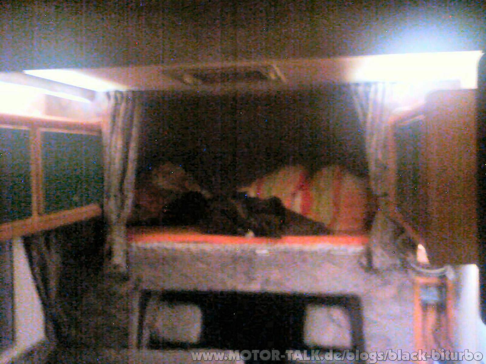Zum "wohnen" im WoMo: Erstmal das Beste: das WoMo scheint dicht zu sein *freu*. Dennoch gab es ein paar Punkte zu bemängeln. Zu allererst die Trittstufe: Diese ist etwas lebensgefährlich, da sie dank dunklem Metall am Tag recht "warm" wird und dann nachts eine schöne glatte Eisfläche bildet. Wenn man morgens noch verschlafen den Hund raus lässt eine böse falle. Weiter wäre eine Gasfüllstandsanzeige etwas sehr angenehmes. Die Vorstellung das nachts die Heizung ausfällt ist ja nicht gerade die schönste und der gewichtstest ist a) sehr ungenau und b) sehr aufwändig (Flasche entzurren, rausholen hochheben). Da ich keinen elktroheizofen mithatte hätte es bedeutet, dass ich mitten in der Nacht raus muss und die Flaschen umstecken muss - gottseidank hatte ich aber Glück und die 1te Flasche hat über das WE. Nun zu diesen Auffahrdingern, damit das WoMo grade steht: Was ich da habe ist der letzte Mist!!!! Man schleudert sie zwar lustig über den CP, halten tun sie aber nicht für 5 Pfennig. Naja, der Platz war aber eh recht eben. Und jetzt zu dem blödesten Manko: Da es sich hier ja um ein nicht integriertes WoMo handelt ist die Isolierung vorne eher mies. Auch strömt vorne keine Luft von der Heizung aus. Das Ergebnis sind kalte Füße auf der vorderen Sitzbank - und man kann trotz Vorhang nichts dagegen machen (auch wenn man das WoMo auf etwa 180°C Umluft aufheizt bleiben die Füße kalt (wie soll das erst werden wenn die Freundin mitfährt