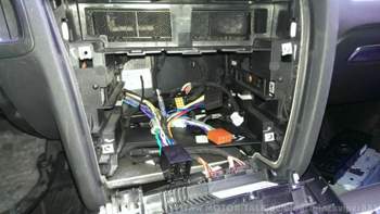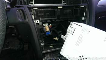 Als 3. Schritt hab ich den ISO Kabelsatz verlegt , was auch die meiste Zeit in Anspruch nimmt. Es muss doch schon einiges an Verkleidungen demontiert werden um alles sauber verlegen zu können. Ich fang einfach mal vorn beim Radio an. Um dieses auszubauen müsst ihr die Lüftungsdüse und das Bedienteil für die Klimaanlage ausbauen, diese sind nur geclipst. Ich hab ebenfalls noch die Blende vom Display demontiert.Das Bedienteil vorsichtig raushebeln und die Luftdüse mit einen längeren Haken auf einen zu ziehen, dazu mit dem Haken in die Düse gehen und halt suchen. Nun findet ihr die 4 Schrauben mit dem das Radio befestigt ist, diese lösen,das Radio vorsichtig rausziehen und die Stecker vom Radio abziehen.