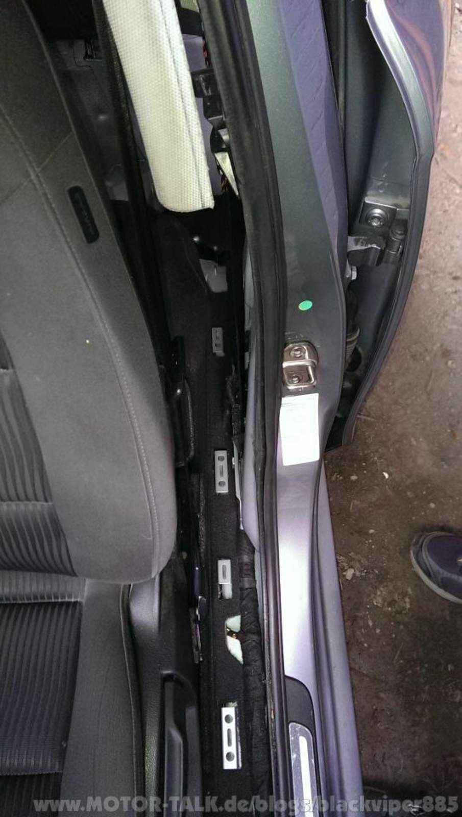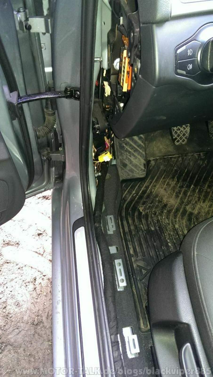 Als nächstes müsst ihr die Rückbank ausbauen, dazu greift ihr auf beiden Seiten mit beiden Händen unter die Sitzpolster und zieht diese mit Kraft ruckartig nach oben, dann könnt ihr die Rücksitzbank entnehmen. Die Kunststoffklammern hängen jetzt entweder noch unter dem Sitz oder ist kaputt Jetzt entfernt das Seitenpolster, ist unten mit einer Torx Schraube befestigt. Jetzt könnt ihr das Polster nach unten rausziehen. Achtung wenn dort ein Seitenairbag verbaut sein sollte !!! Jetzt kann man die Verkleidung ausbauen in dem man mittig von Einstieg die Leiste hochzieht und an der C-Säule Richtung fahrzeugmitte zieht. Das einzigste was jetzt noch stört ist die Verkleidung der B-Säule. Dazu die Verkleidung oben am Gurt ausclipsen,erst jetzt geht die untere zu lösen. Diese oben Richtung fahrzeugmitte ziehen und dann könnt ihr das Teil unten aushängen. Bitte gleich darauf achten das ihr alle Clipse gleich wieder von der Karosserie in die Verkleidung steckt. Und jetzt könnt ihr den Kabelsatz von vorn durchziehen und parallel zum dem originalen verlegen und mit reichlich Kabelbindern fixieren. Danach alles wieder zusammen bauen. Aber mit der B-Säule anfangen, da die anderen dann darauf überlappen.