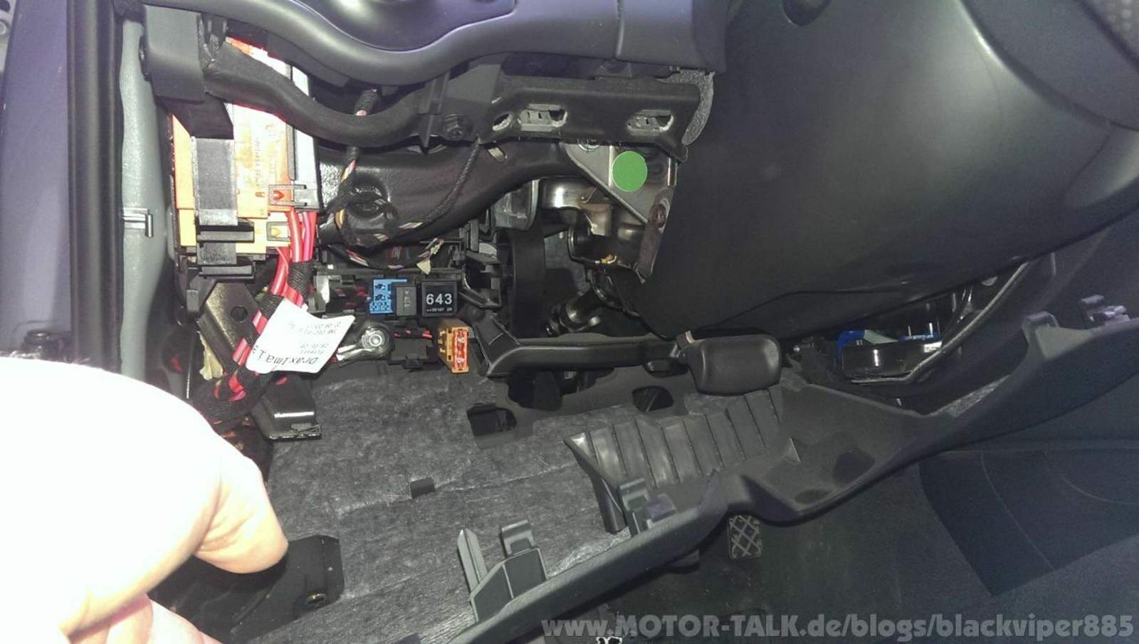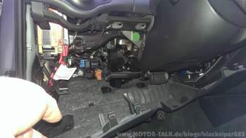 Jetzt die Verkleidung im Fussraum unter bzw neben der Lenksäule abbauen. diese ist verschraubt und geclipst. Es sind 3 Schrauben, eine im Sicherungskasten und zwei unten im Fussraum. Sind diese draussen kann man die Verkleidung oben ausclipsen und vorsichtig nach unten klappen.