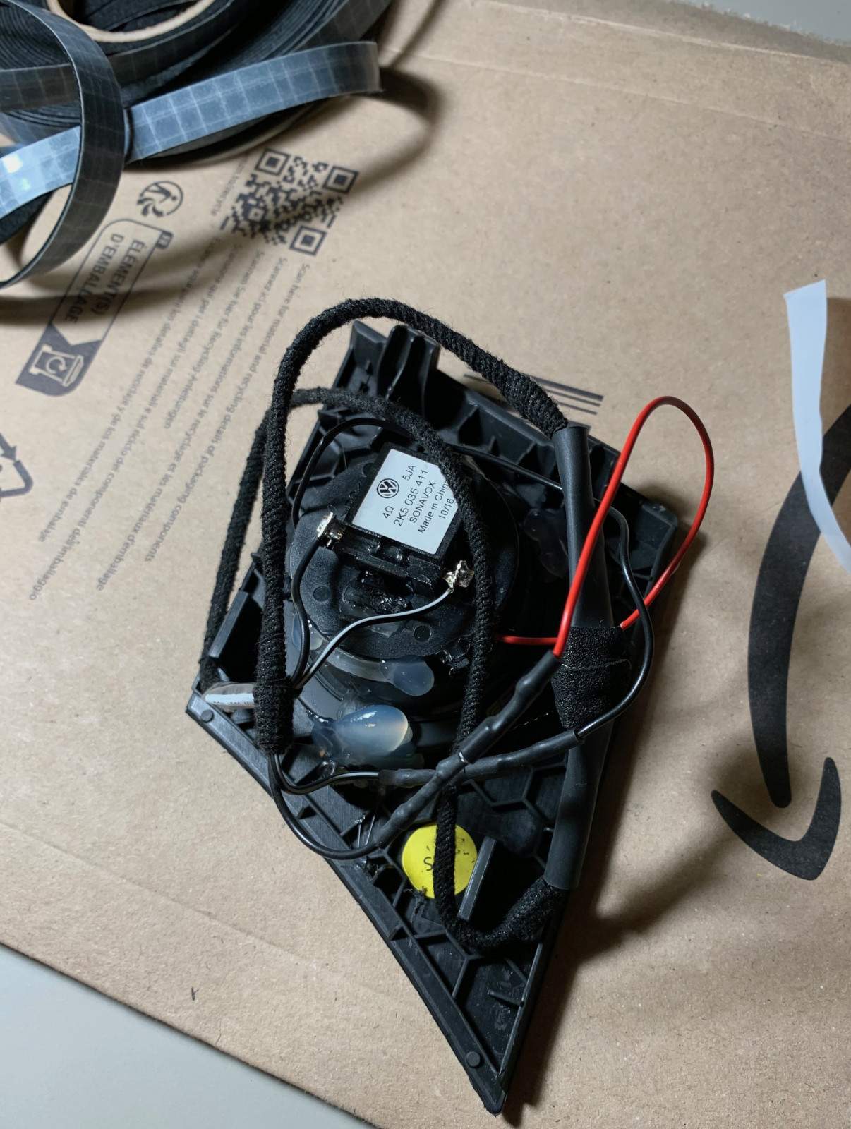 Auf die gleiche Weise ist die Rückplatte an die Hochtöner angebracht, in der die Anschlussbuchse und ein Kondensator als Hochpass integriert ist. Da ich die originalen Stecker (Bild 2) und Buchsen weiter nutzen und erhalten wollte, löste ich also auch die Rückplatte der Hochtöner, in denen die Buchse integriert ist (siehe Bild 3) vom originalen Hochtöner und entfernte den nun nicht mehr benötigten Kondensator, da in dem Eton Set schon ein passender Kondensator im Anschlusskabel integriert ist - plug & play - also fast. Ich musste jetzt nur noch die neuen Hochtöner mit etwas Anpassung und mithilfe von Moosgummi (gegen Vibrationen und Schnarren/Rasseln) einsetzen und die Teile mit Heißleim wieder verbinden. Zudem verlötete ich das neue Anschlusskabel mit der angebrachten Originalbuchse und sicherte alles mit Heißleim, Schrumpfschläuchen und Kabelbindern in einem kompakten Bündel, gegen Rasseln nutze ich noch etwas Moosgummi. Das ganze Bündel (Bild 4) konnte schließlich wieder am originalen Bauplatz eingesetzt werden.