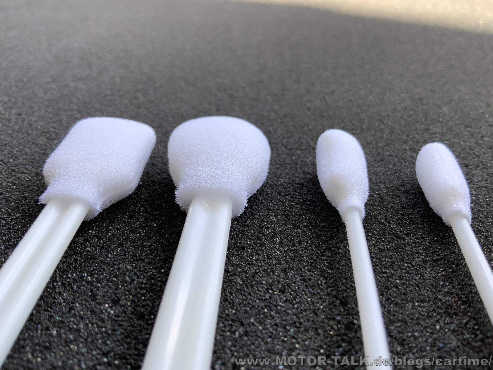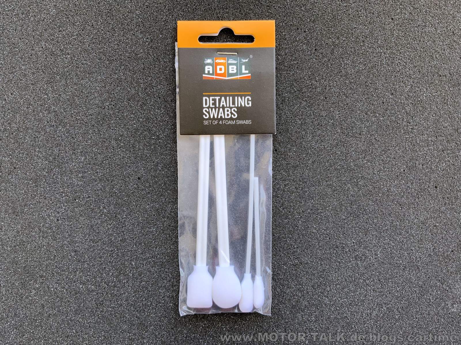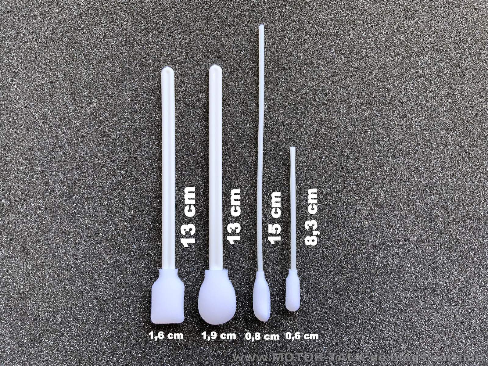 Dieses Mal sind es die ADBL Detailing Swabs. Es handelt sich dabei um kleine Reinigungsstäbchpinsel, die in einem 4er Set kommen. Es sind vier verschiedene Größen in einer Clip Packung enthalten. Der Kunststoffstiel ist sogar etwas elastisch. Somit kann man auch um Kurven oder Ecken gehen. Der weiße Schaumstoff ist sehr weich.